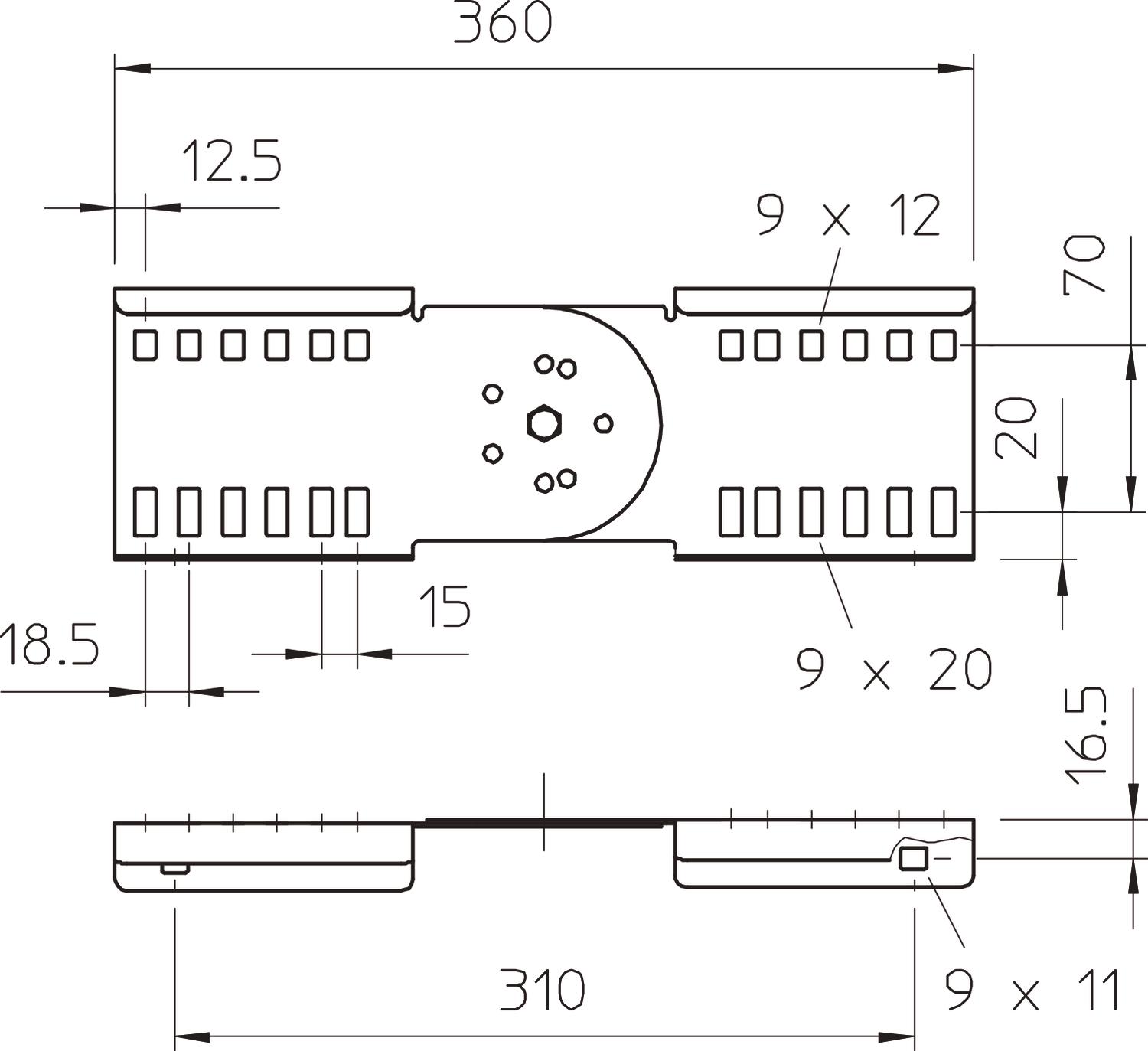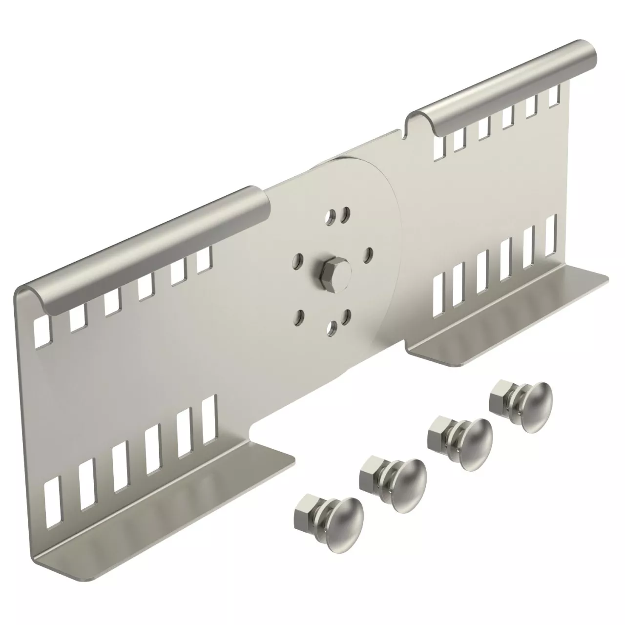 Łączniki przegubowe jako łączniki naroża zewnętrznego do łączenia drabin kablowych i kształtek o wysokości boku 110 mm i przelotowej perforacji ścianek. Kąty regulowane w pionie.