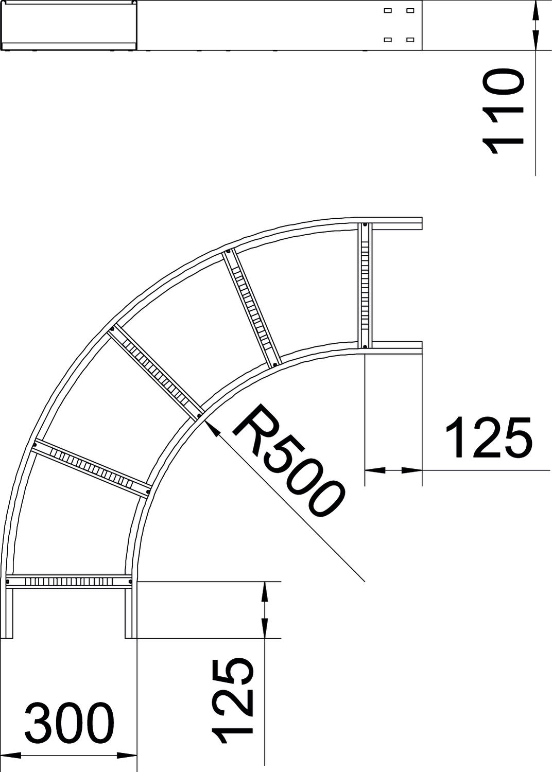 90° bend, horizontal, for all wide span cable ladders of 110 mm side height.