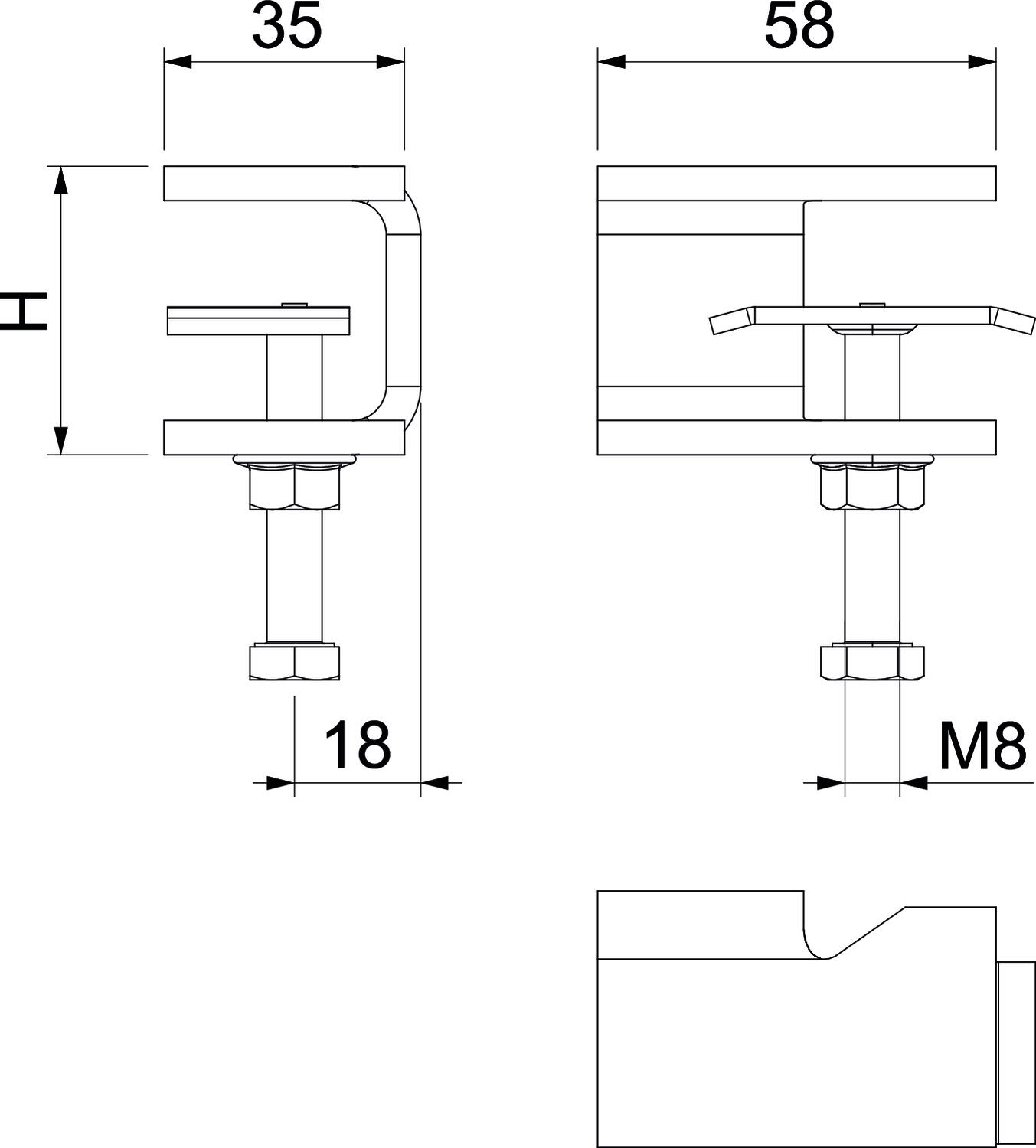 Zacisk do ustalania położenia drabin kablowych biegnących poziomo na stalowych konstrukcjach poziomych.