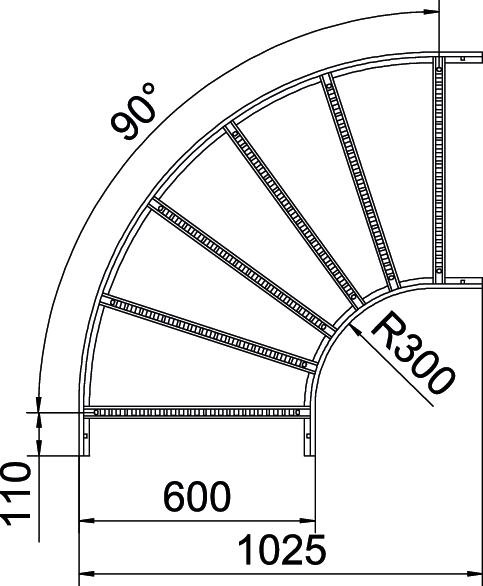 Łuk poziomy 90° z przyspawanymi szczeblami do wszystkich typów drabin kablowych o wysokości boku 110 mm.