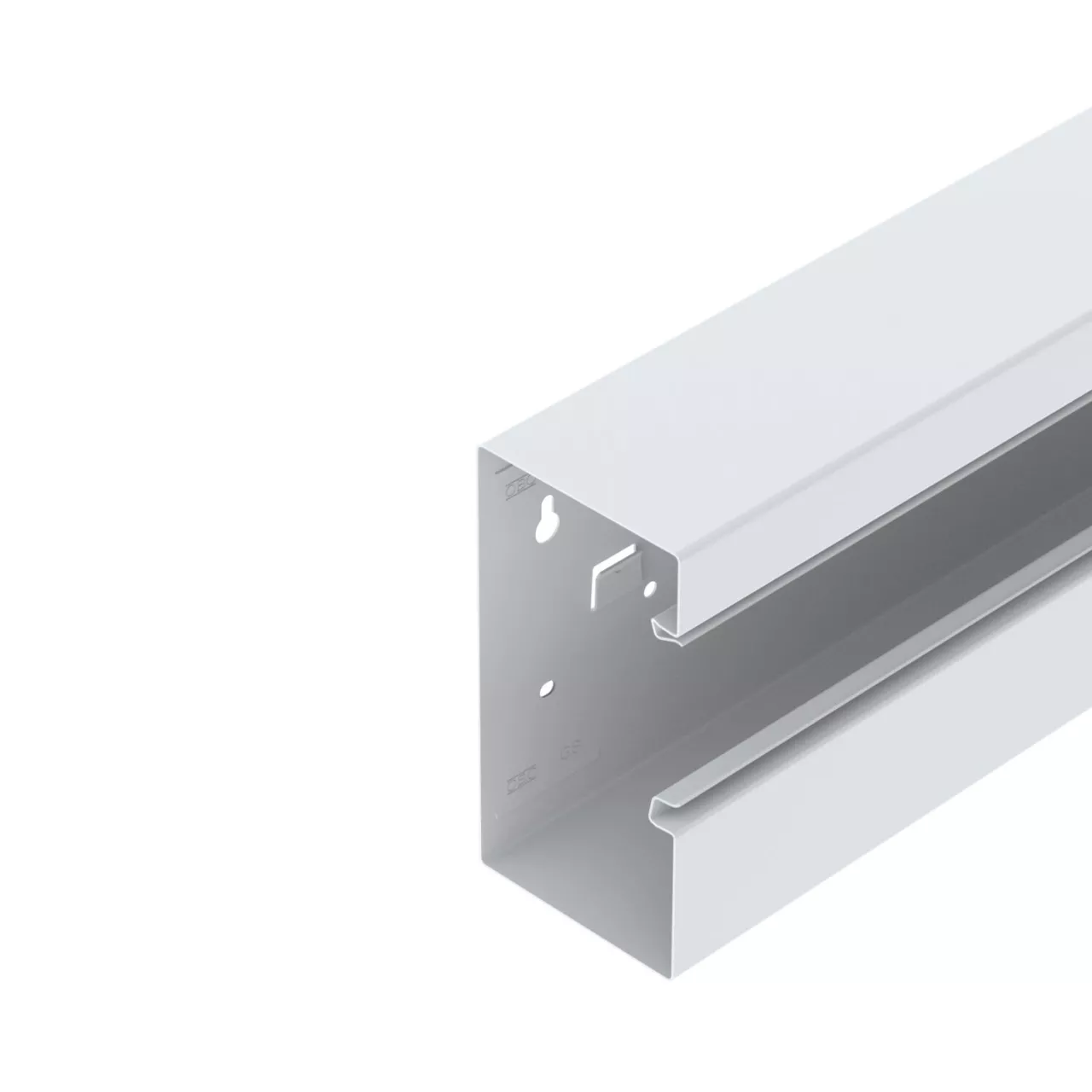 Kanał podparapetowy GS do montażu bezpośrednio na ścianie lub na wspornikach montażowych. Kanał podparapetowy GS jest wyposażony w języczki samostykowe do mocowania przegrody z blachy stalowej. Wyrównanie potencjałów między podstawami kanałów jest zapewnione dzięki złączce. Opatentowana, samostykowa pokrywa kanału gwarantuje zabezpieczenie i wyrównanie potencjałów między podstawą a pokrywą. Otwór systemowy wynosi 76,5 mm. Pokrywę należy zamawiać osobno.