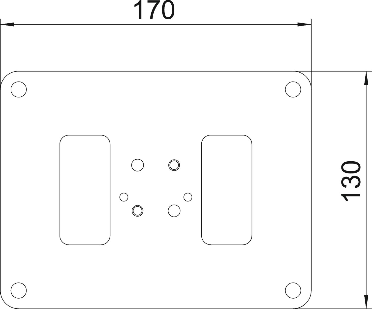 Płyta podlogowa z widoczną krawędzią 30 mm i 4 otworami montażowymi Ø 8,5 mm. Pasuje również do kolumn zasilających typ ISS70110.
