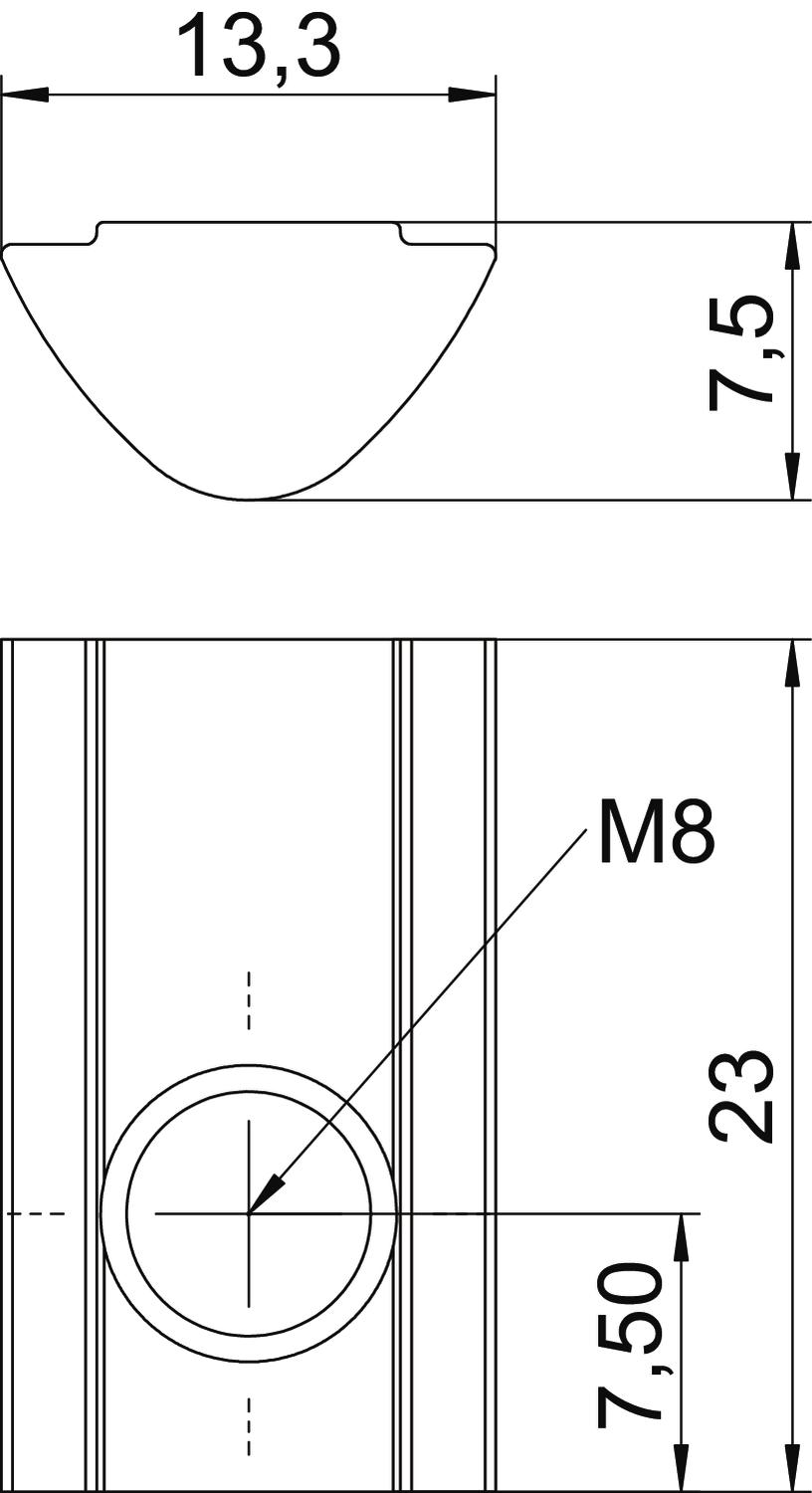 Przesuwna nakrętka z gwintem M8 do montażu elemntów dodatkowych i osprzętu w profilu kolumny ISS. Element dociskowy w dolnej części pozwala na obracanie elemntu. Jest automatyczne blokowany przez skręcie przez profil w górnej części.