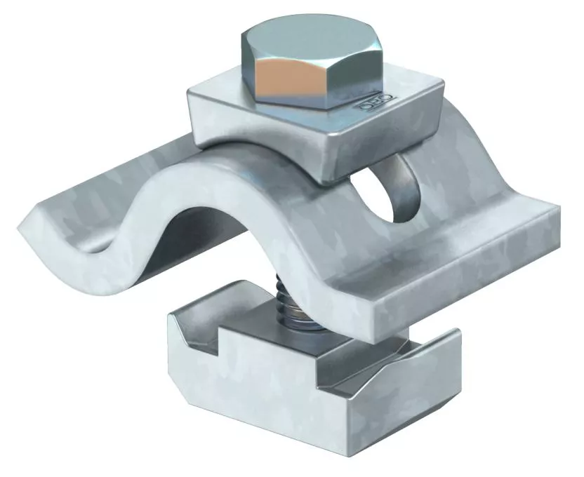 Zacisk mocujący z nakrętką kontrującą do zamocowania szyn profilowych do kołnierzy konstrukcji stalowych.
