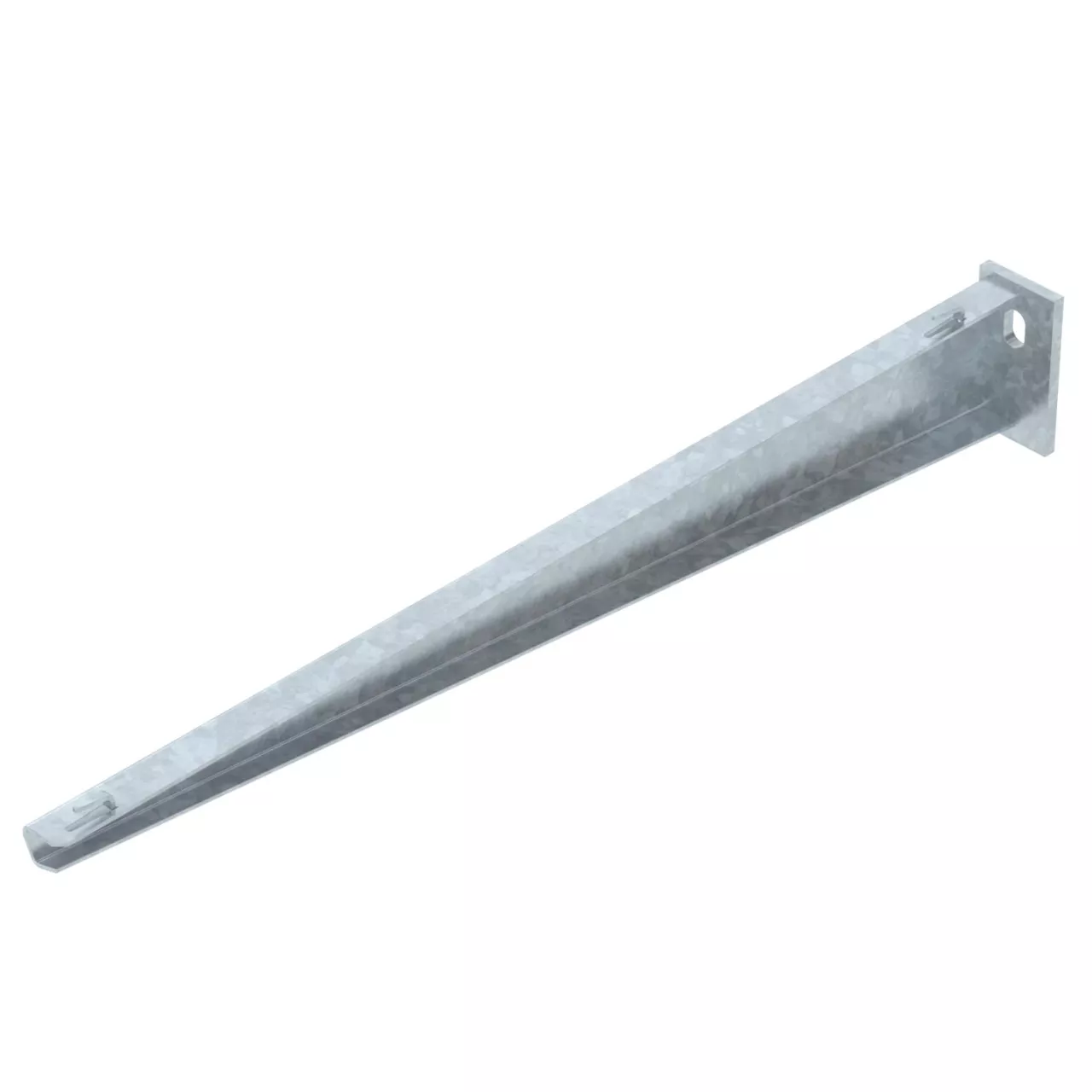 Lekki wspornik ścienno-wieszakowy z przyspawaną głowicy do bezśrubowego zamocowania korytek siatkowych.