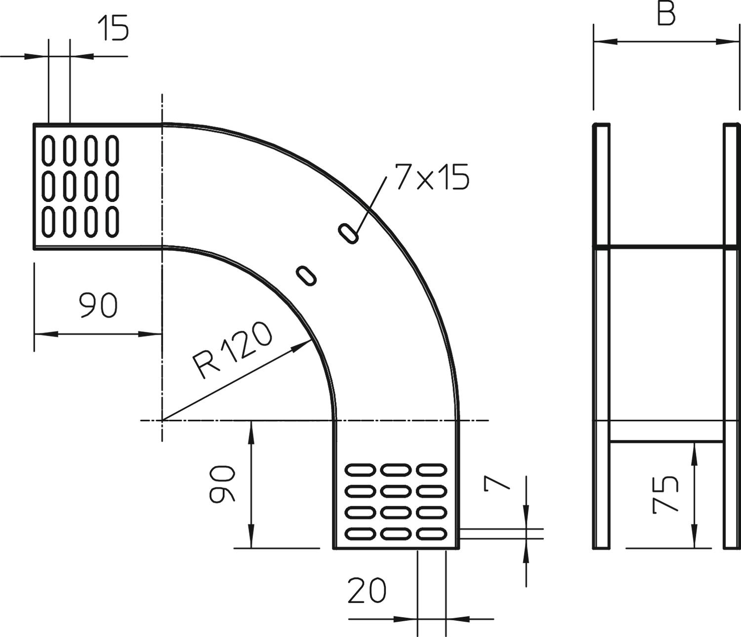 Łuk pionowy 90° opadający, do wszystkich typów koryt o wys. boku 85 mm.