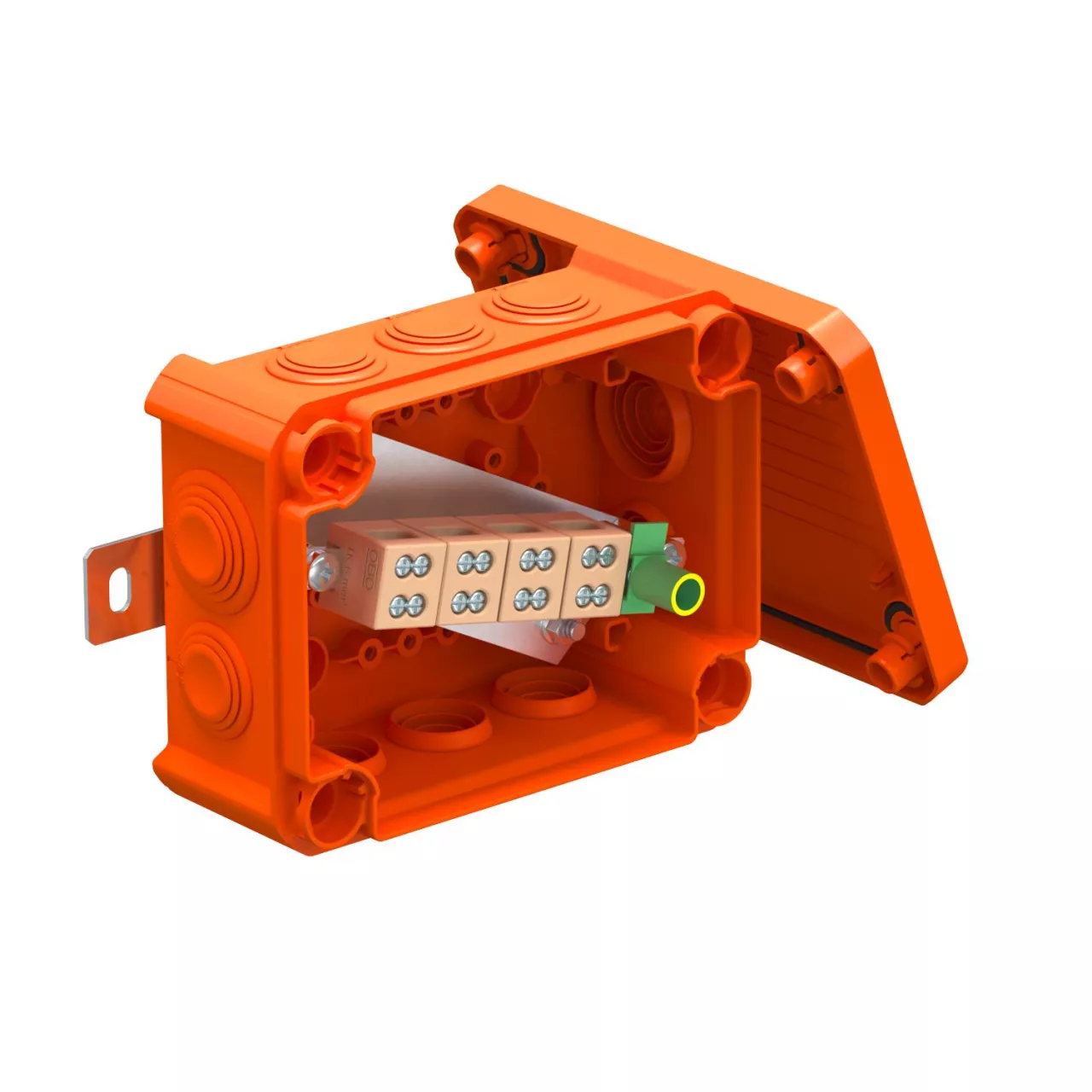 Puszka przyłączeniowa z ceramicznymi podwójnymi zaciskami i dławikami elastycznymi. Wystarczająca ilość miejsca na okablowanie dzięki ukośnie ułożonej jednostce przyłączeniowej z całkowicie zmontowanymi, odpornymi na wysoką temperaturę zaciskami ceramicznymi. Zacisk przewodu ochronnego oznaczony kolorem zielonym i żółtym. Mocowanie do łatwo dostępnych uchwytów zewnętrznych. Dopuszczony do systemów kablowych z podtrzymaniem funkcji elektrycznych zgodnie z DIN 4102 część 12 w klasach E30, E60 i E90. Zaciski ceramiczne zgodne z normą DIN EN 60998-2-1:2004.