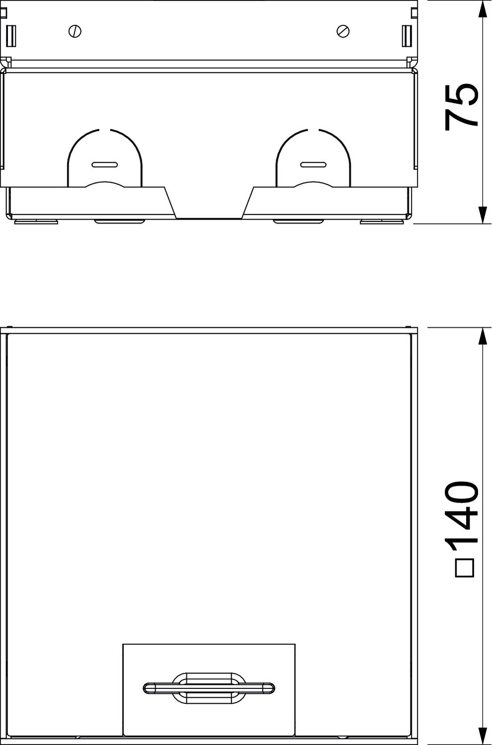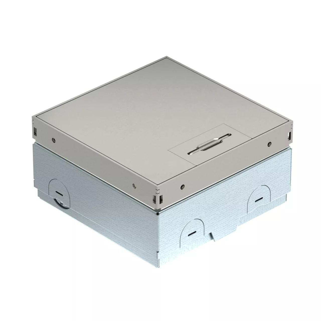 Square floor socket for use in dry-care systems and screed floors in indoor areas. Installation housing with pre-marked insertion openings for pipes (M20/M25). Cover adjustable to top edge of floor covering using four height-adjustment supports. The minimum installation depth is 75 mm, the height-adjustment range +30 mm. Frame and cover made of stainless steel and visible in the floor covering. Cover with decorative plate. The load-bearing capacity of 15 kN is only guaranteed when in an unused state. A protective contact socket (NF) is included in the delivery. A data socket can optionally be installed in the data technology plate. When delivered, the item is closed with a blanking plate.