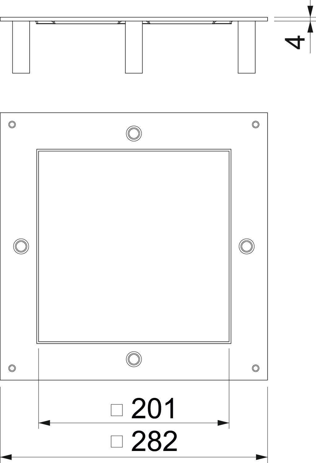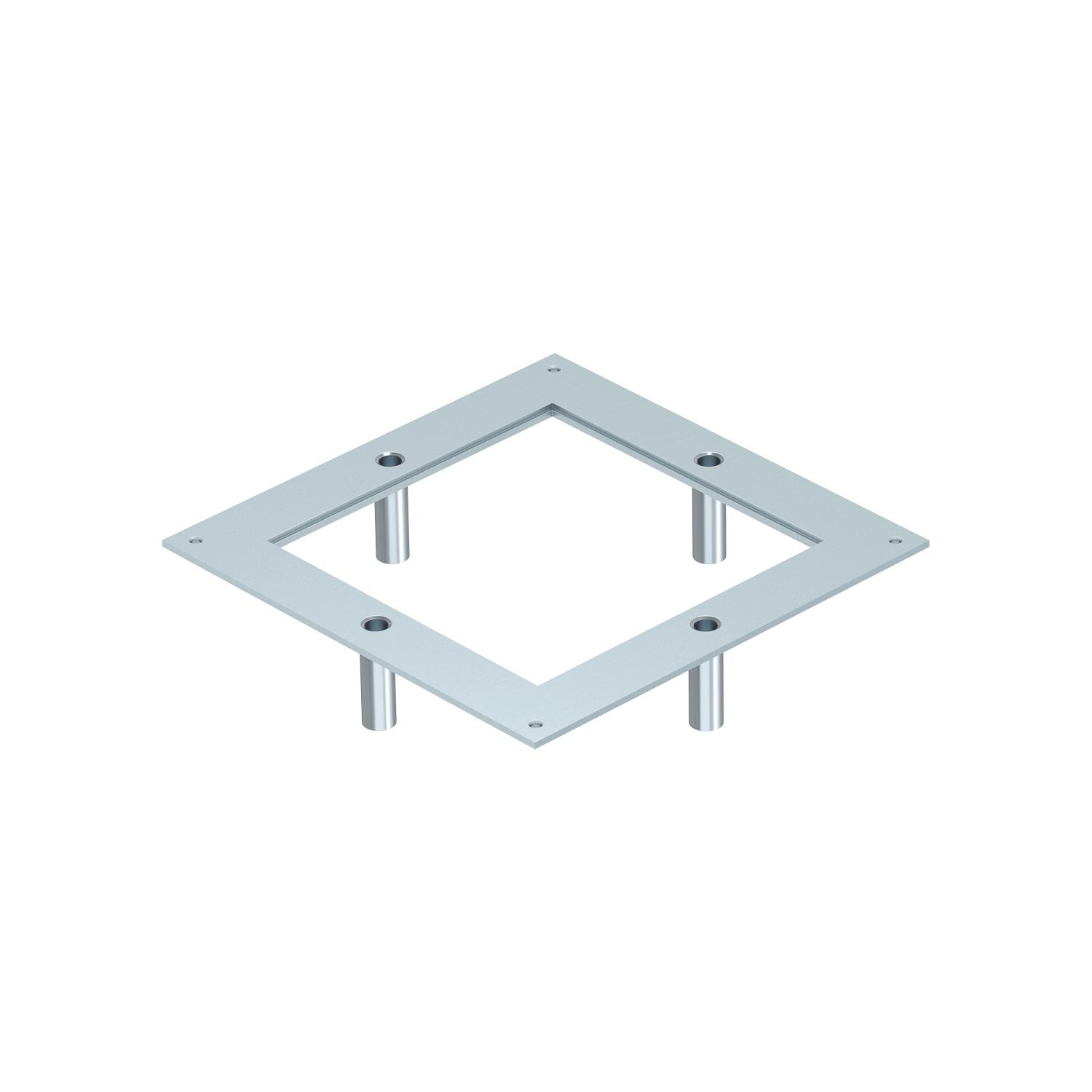 Wzmocniona pokrywa montażowa do puszki podpodłogowej UZD250-3 jest przystosowana do montażu kwadratowej kasety do wysokich obciążeń wielkości znamionowej 4. Otwór montażowy jest pogłębiony o 3 mm, można go później zamknąć pokrywą zaślepiającą.