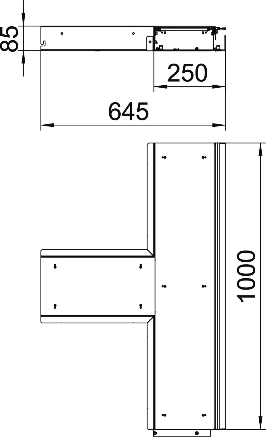 Gotowe do montażu połączenie jednostki kanału z listwą szczotkową i jednostki kanału do prowadzenia przewodów, składające się z podstaw kanałów, dwóch pokryw, profili bocznych o regulowanej wysokości i listwy szczotkowej do wyprowadzenia przewodów umieszczonych od strony ściany. Zakres dostawy obejmuje dwie pokrywy uszczelki oraz dwa łączniki. Do regulacji w zakresie wysokości należy dodatkowo zamówić sześć elementów regulujących.