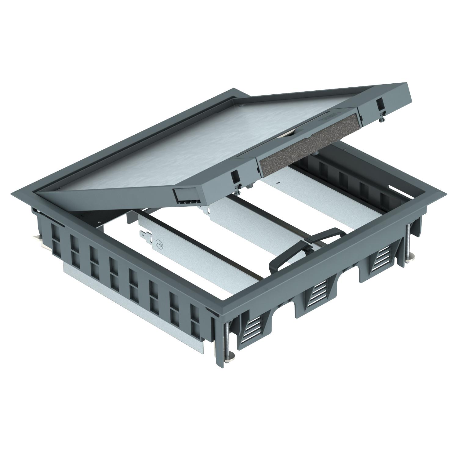 Kaseta zasilająca z ramką montażową wykonaną z metalu do montażu 3 płytek APMT5, do stosowania w puszkach podpodłogowych UGD i UDS.
