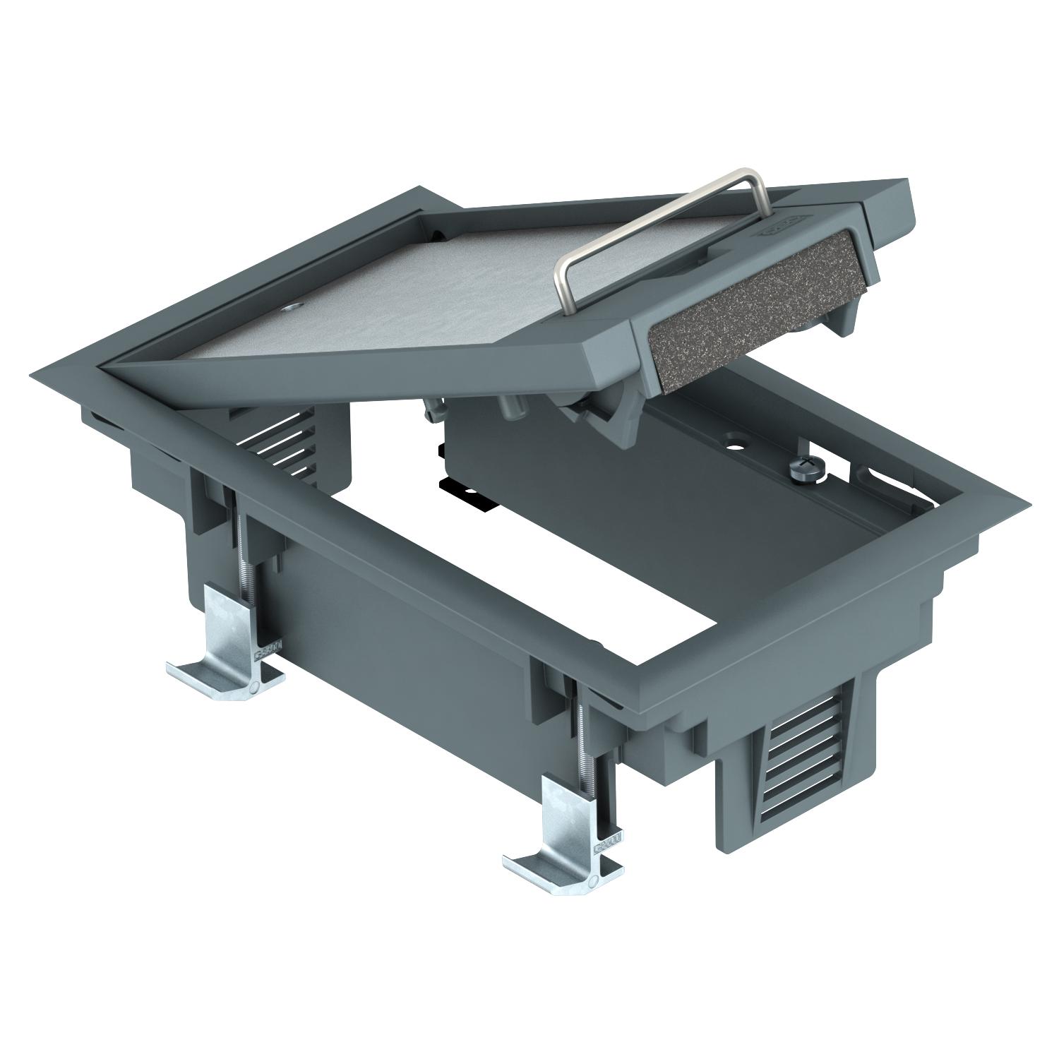 Kaseta zasilająca z uchwytem do podnoszenia, na 3 x Modul 45 w 1 uniwersalnej puszce instalacyjnej UT3, do zastosowania w podłogach systemowych.