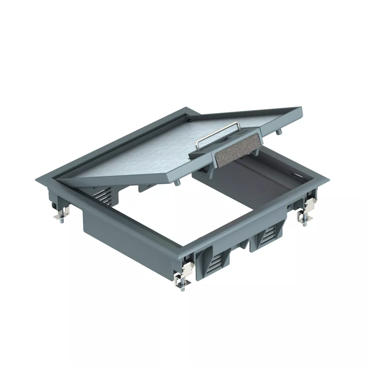 Kaseta zasilająca uchwytem do podnoszenia pokrywy, na 6 x Modul 45 w 2 uniwersalnych puszkach instalacyjnych UT3, do zastosowania w systemach kanałów i w podłogach systemowych.