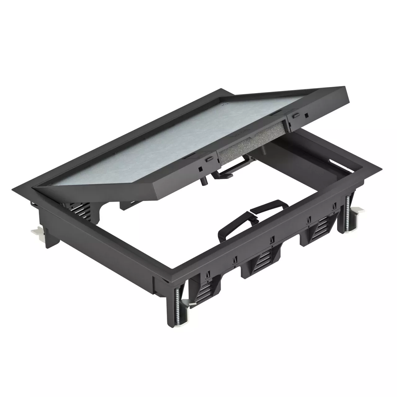 Kaseta zasilająca z zamkami, na 9 x Modul 45 w 3 uniwersalnych puszkach instalacyjnych UT3, do zastosowania w systemach kanałów i w podłogach systemowych.