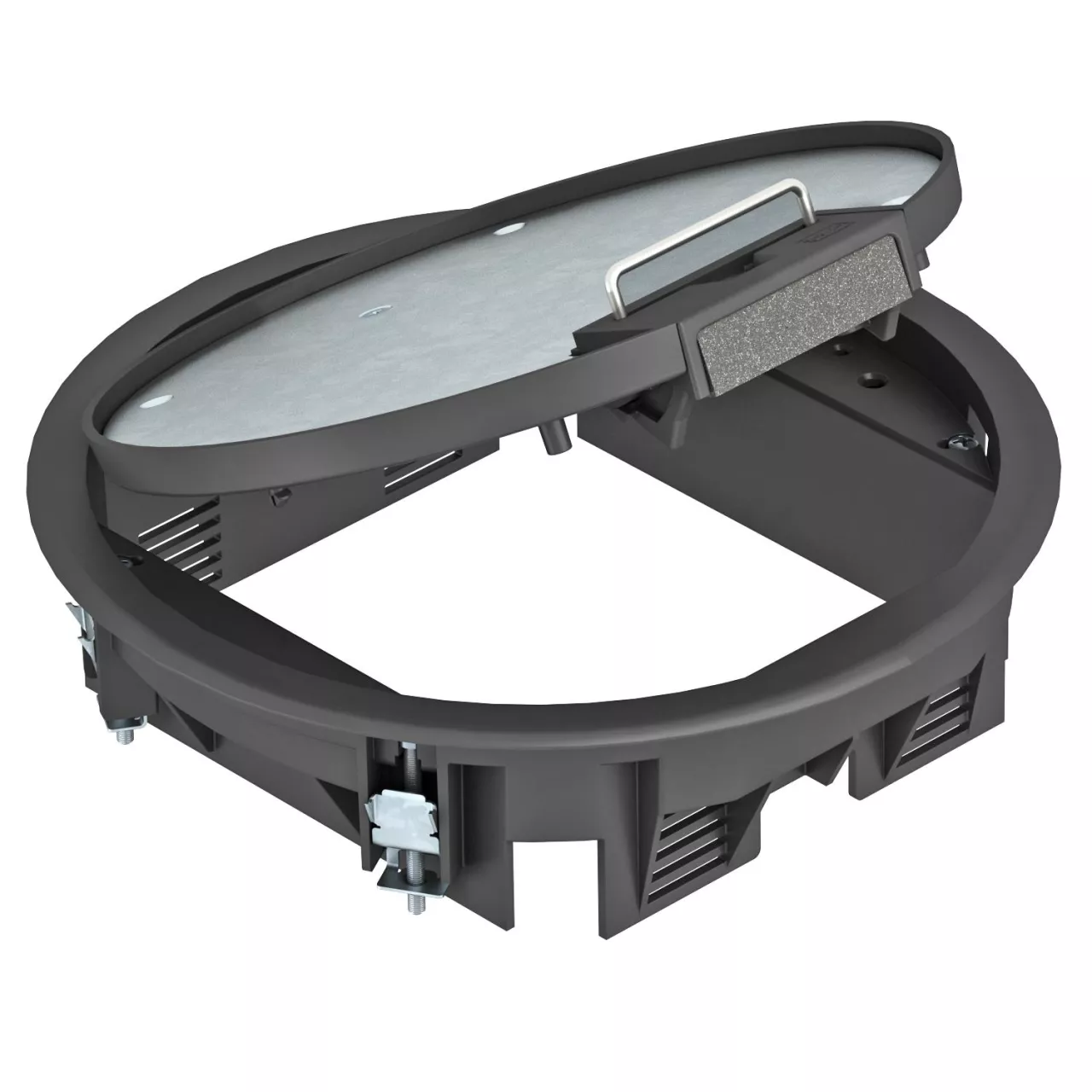 Kaseta zasilająca uchwytem do podnoszenia pokrywy, na 6 x Modul 45 w 2 uniwersalnych puszkach instalacyjnych UT3, do zastosowania w systemach kanałów i w podłogach systemowych.