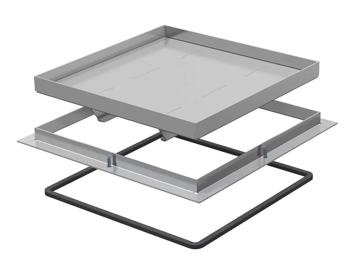 Rama kasetonowa „zaślepiona" do zamknięcia otworu rewizyjnego na puszce podpodłogowej UZD350-3 w podłogach czyszczonych na sucho i mokro. Klasa obciążeń 2 do 20 kN. Przeznaczona tylko do podłóg gładkich.