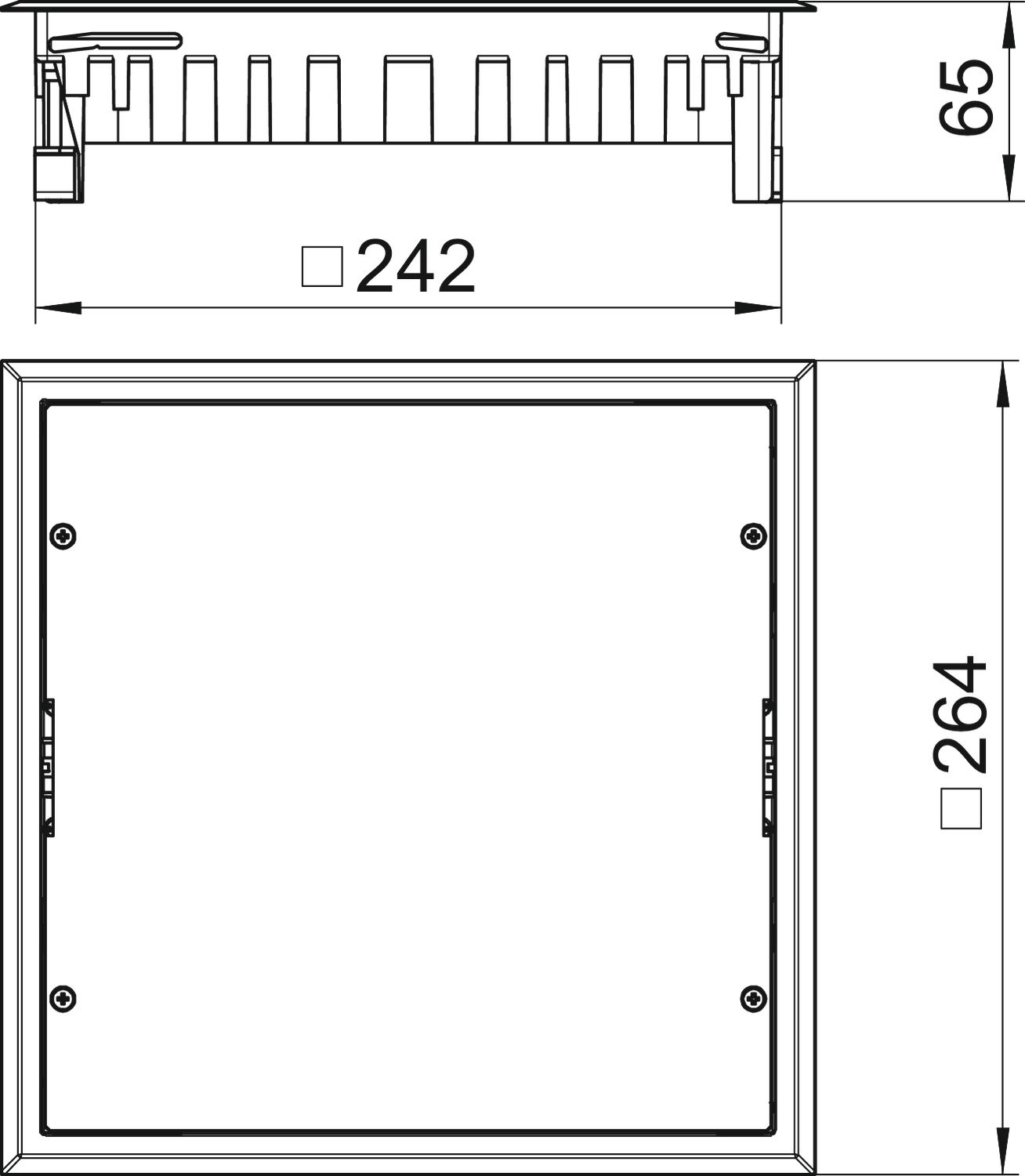 Kaseta rewizyjna do zamknięcia prostokątnego otworu montażowego wielkości znamionowej 9 w systemach kanałów i w podłogach technicznych. Ochronna ramka dywanowa wykonana z poliamidu.