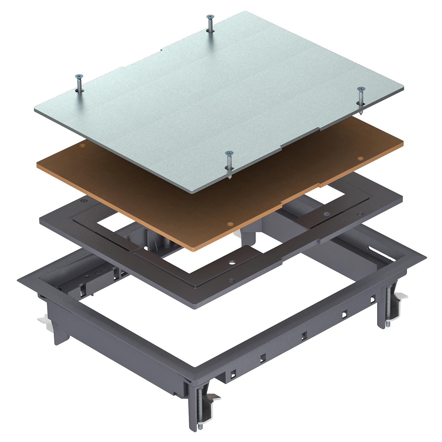 Kaseta rewizyjna do zamknięcia prostokątnego otworu montażowego wielkości znamionowej 6 w systemach kanałów i w podłogach technicznych. Ochronna ramka dywanowa wykonana z poliamidu.