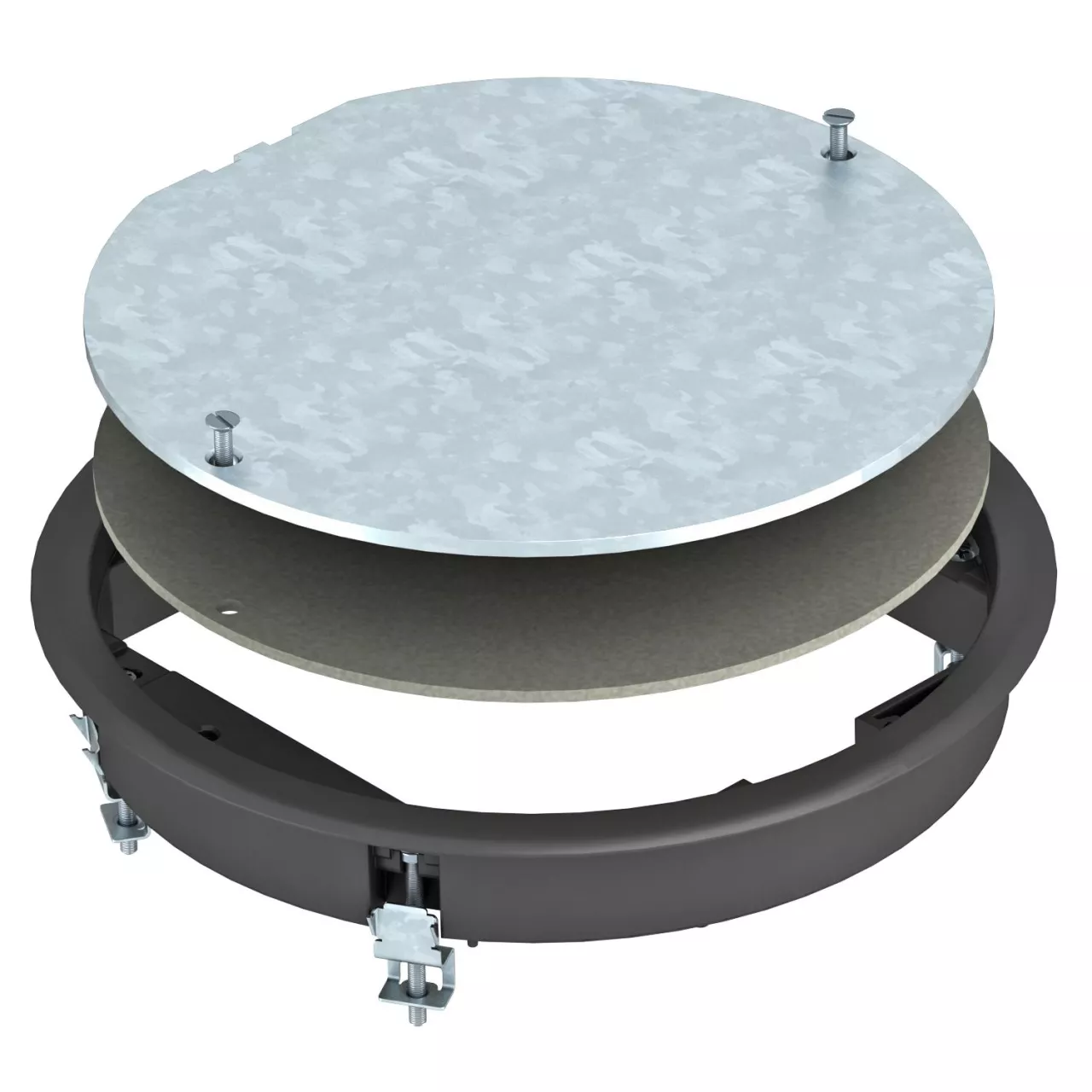 Kaseta rewizyjna do zamknięcia okrągłego otworu montażowego wielkości znamionowej R4 w systemach kanałów i podłogach technicznych.