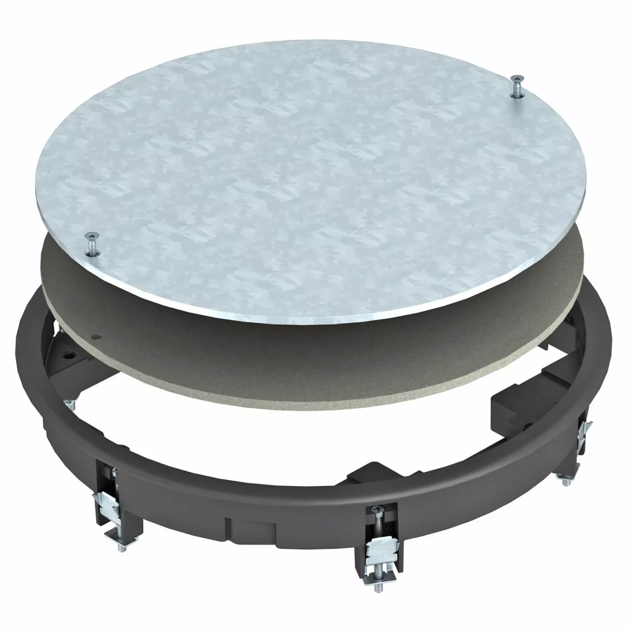 Kaseta rewizyjna do zamknięcia okrągłego otworu montażowego wielkości znamionowe R7 w systemach kanałów oraz podłogach technicznych. Z uniwersalnym uchwtem montażowym.
