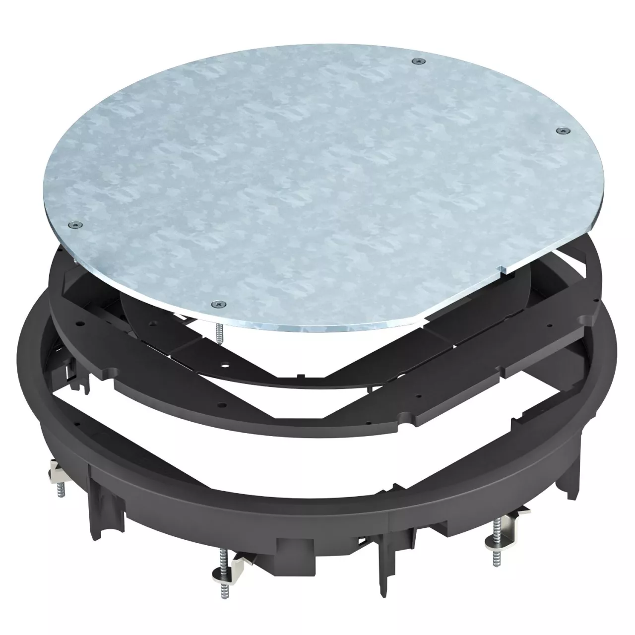 Kaseta rewizyjna do zamknięcia okrągłego otworu montażowego wielkości znamionowe R9 w systemach kanałów oraz podłogach technicznych. Z uniwersalnym uchwtem montażowym. Ochronna ramka dywanowa wykonana z poliamidu. Grubość wykładziny dywanowej maksymalnie 12 mm.