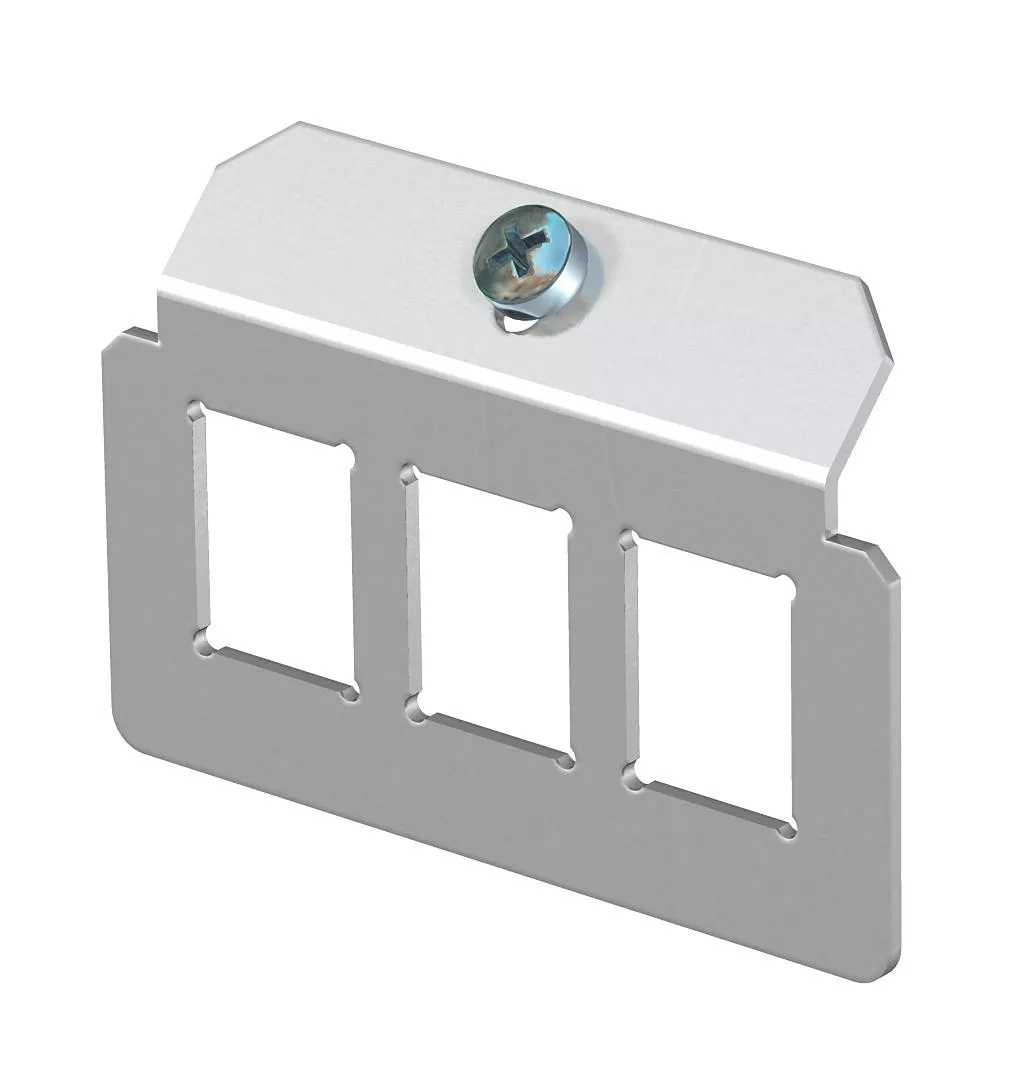 Płytka montażowa na trzy moduły przyłączeniowe teleinformatyczne typu: Brand-Rex: ekranowany; EKU: E-Stone; Dätwyler: KS-T, MS-K i KU-T; R&M: Snap-In i Keystone; Rutenbeck: UM i UMflex; SETEC: MKJ, UKJ i XKJ; Siemon TERA; Telegärtner: AMJ i UMJ; 3M: CAT6 i CAT6A.