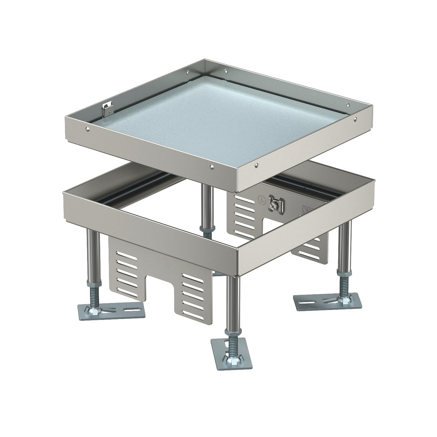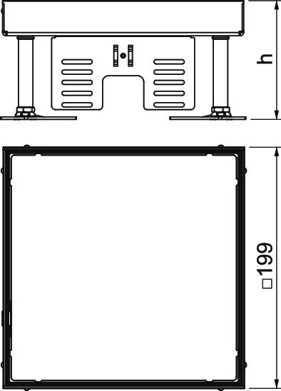 Kwadratowa kaseta do wysokich obciążeń „zaślepiona", do zamknięcia otworu rewizyjnego wielkości znamionowej 4 w systemach kanałów podpodłogowych i podłogach technicznych, czyszczonych na sucho i mokro. Klasa obciążeń 1 do 10 kN. Przeznaczona tylko do podłóg gładkich.
