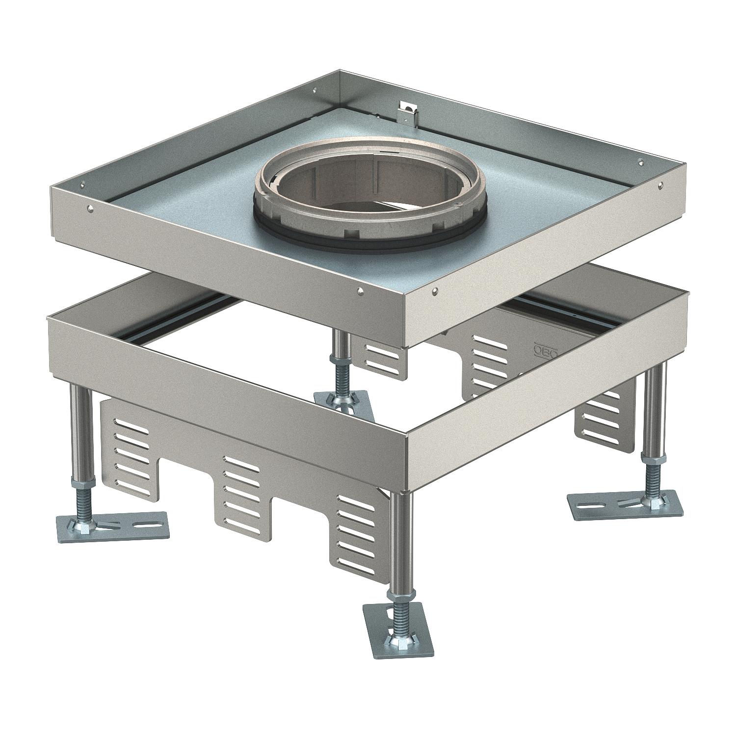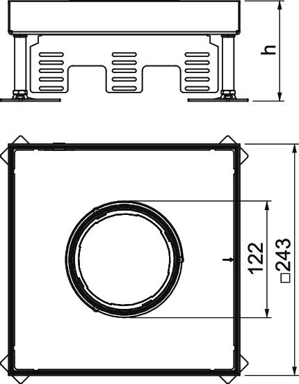 Kwadratowa kaseta do wysokich obciążeń z otworem na tubus, wielkości znamionowej 9, do montażu osprzętu elektroinstalacyjnego w systemach kanałów podpodłogowych i podłogach technicznych, czyszczonych na sucho i mokro. Klasa obciążeń 1 do 10 kN.