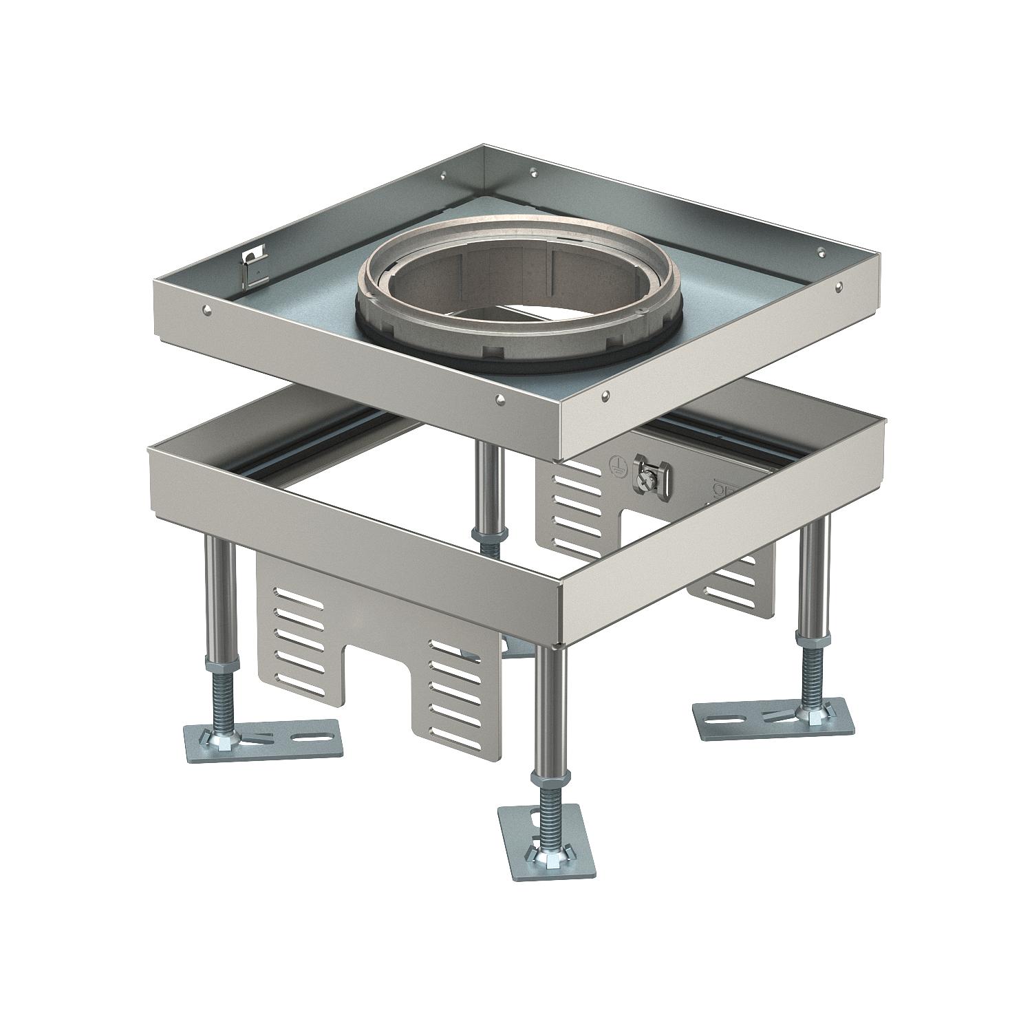 Regulowana kaseta zasilająca wielkości znamionowej 4 z otworem na tubus, do montażu osprzętu elektroinstalcyjnego w podłogach czyszczonych na sucho i mokro.
