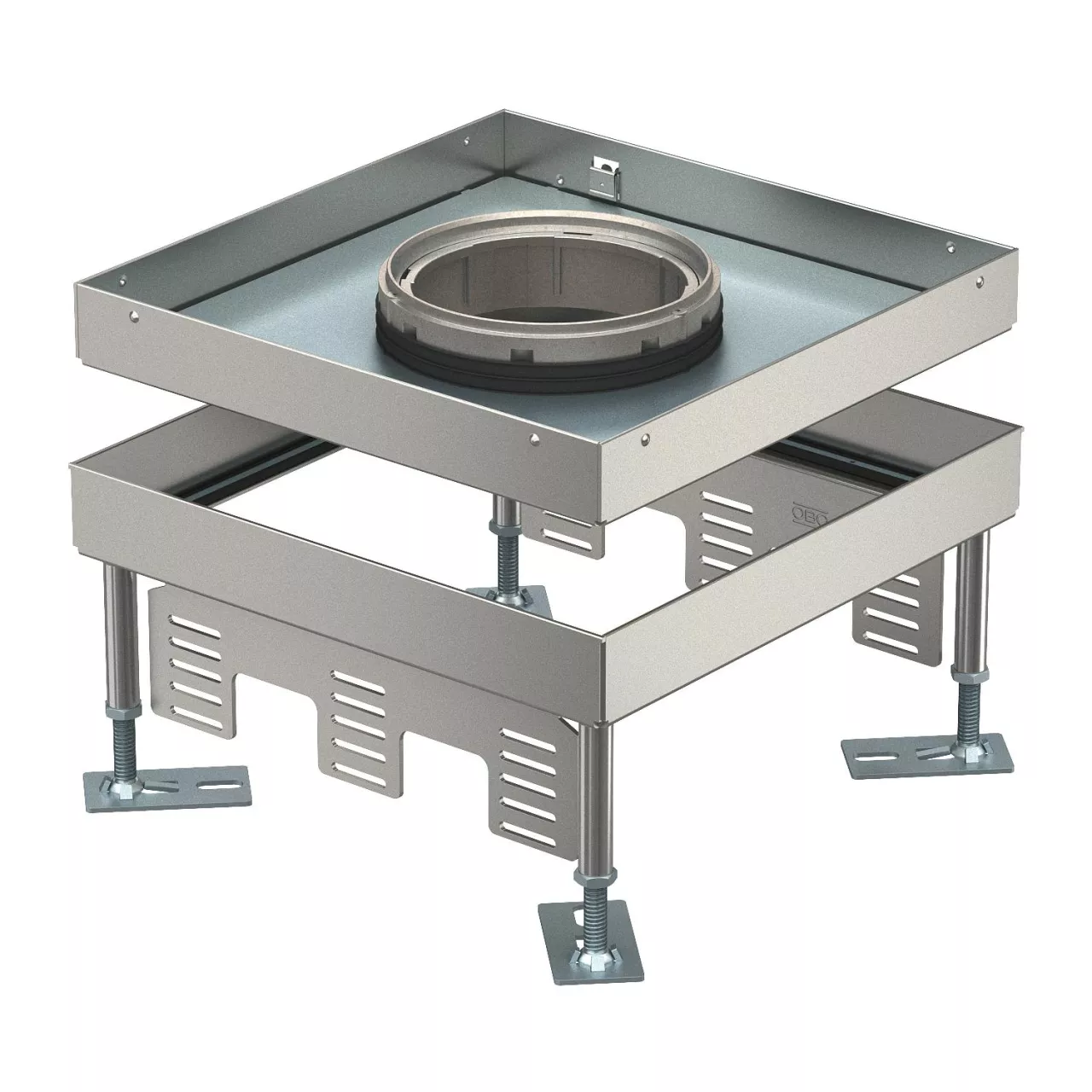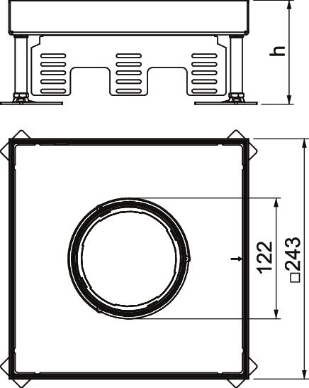 Regulowana kaseta zasilająca wielkości znamionowej 9 z otworem na tubus, do montażu osprzętu elektroinstalcyjnego w podłogach czyszczonych na sucho i mokro.
