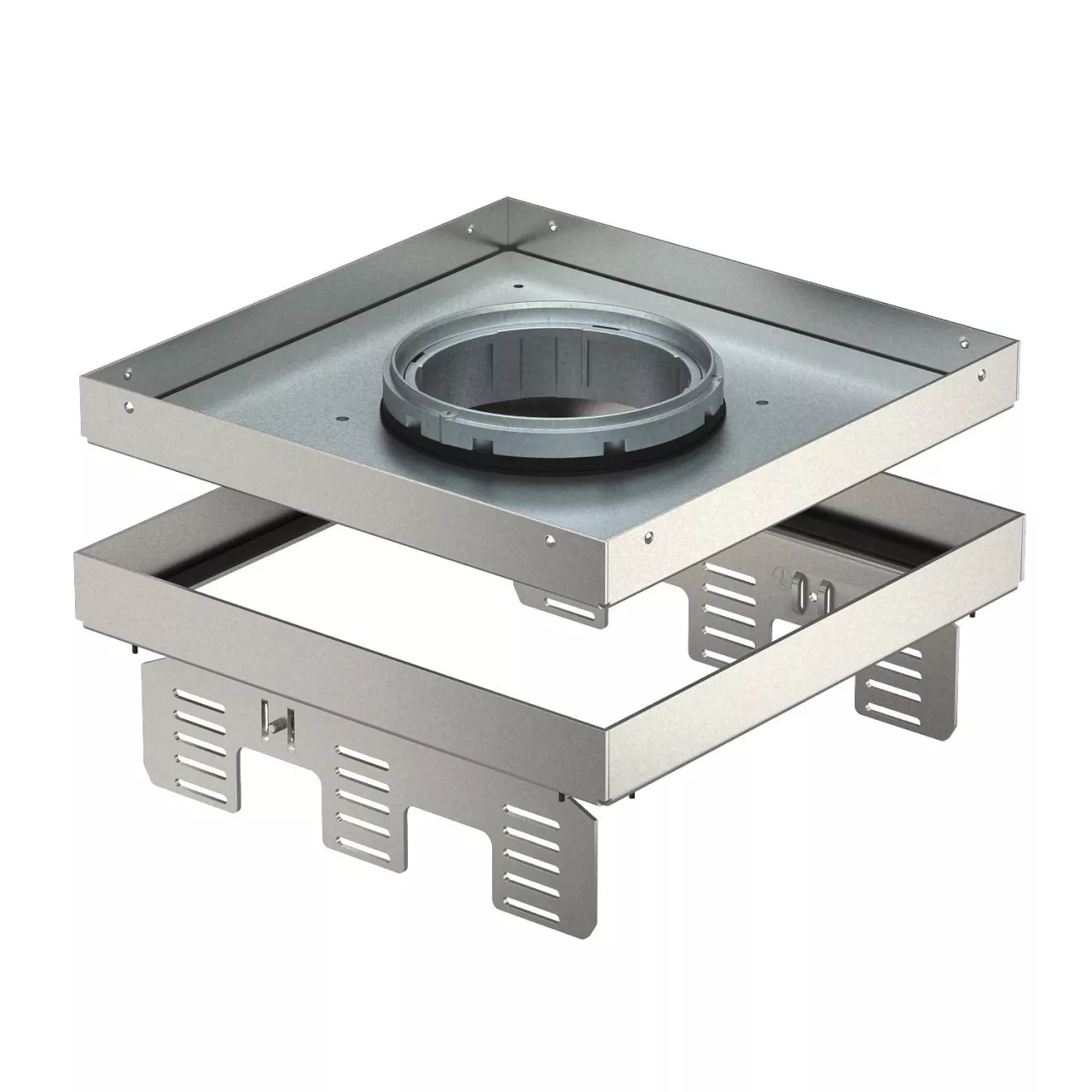 Regulowana, odsprzężana kaseta z otworem na tubus wielkości znamionowej 9, do podłóg czyszczonych na sucho lub mokro, do montażu na puszkach podpodłogowych UZD250-3 lub UZD350-3 w połączeniu z pokrywą montażową DUG../9, w UGD250-3/9 lub UGD350-3/9. Montaż za pomocą kątownika niwelującego (zamawianego osobno) i aluminiowego profilu puszek podpodłogowych.