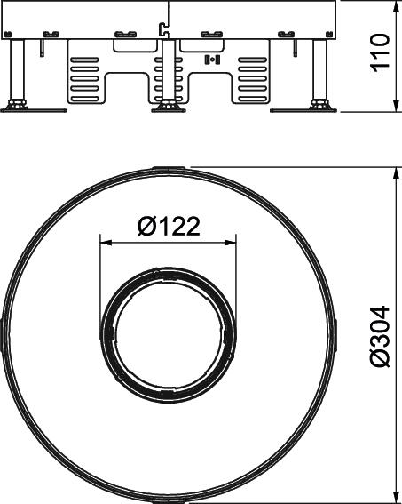 Regulowana kaseta zasilająca wielkości znamionowej R9 z otworem na tubus, do montażu osprzętu elektroinstalcyjnego w podłogach czyszczonych na sucho i mokro.