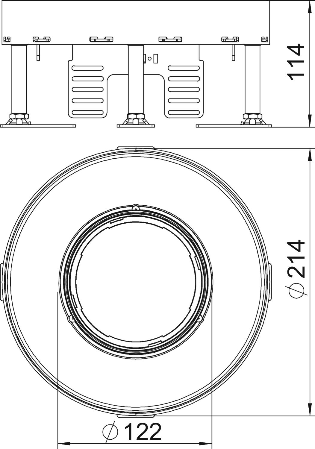 Okrągła kaseta do wysokich obciążeń z otworem na tubus, wielkości znamionowej R4, do montażu osprzętu elektroinstalacyjnego w systemach kanałów i podłogach technicznych, czyszczonych na sucho i mokro. Klasa obciążeń 2 do 20 kN.