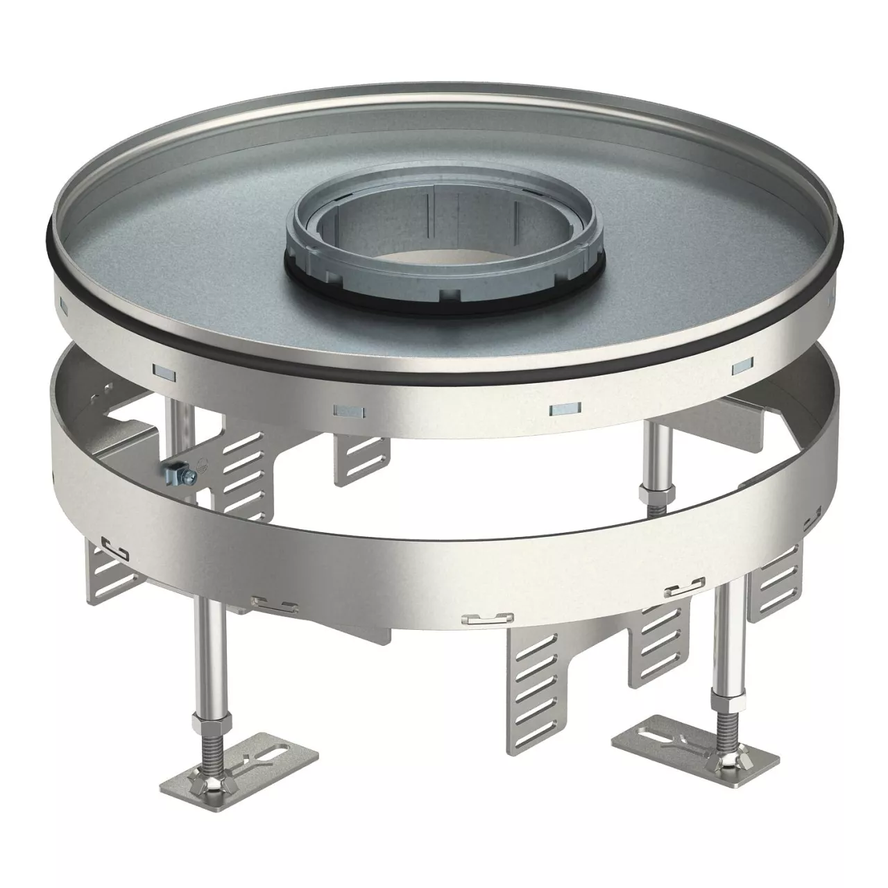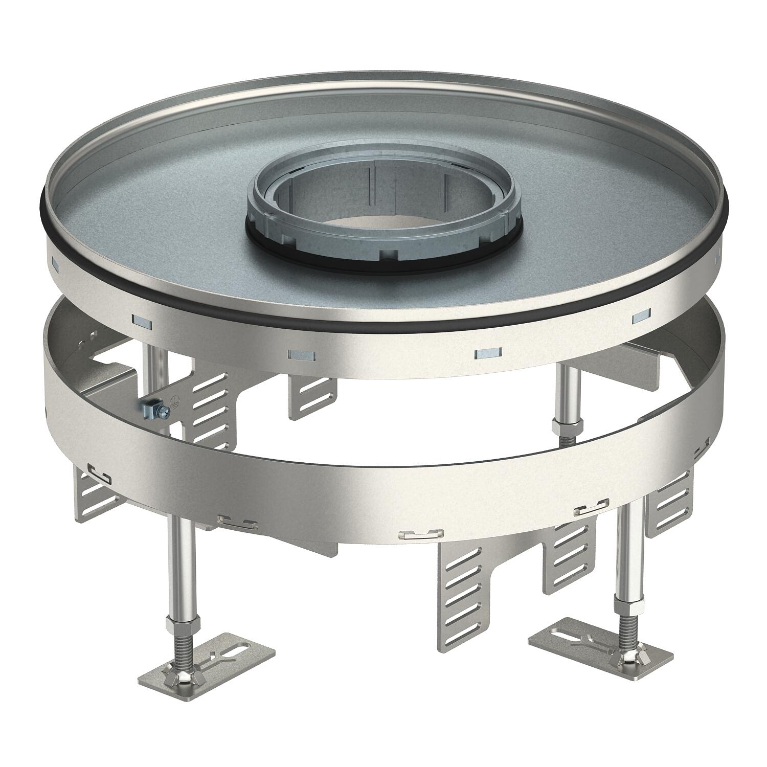 Okrągła kaseta do wysokich obciążeń z otworem na tubus, wielkości znamionowej R9, do montażu osprzętu elektroinstalacyjnego w systemach kanałów i podłogach technicznych, czyszczonych na sucho i mokro. Klasa obciążeń 2 do 20 kN.