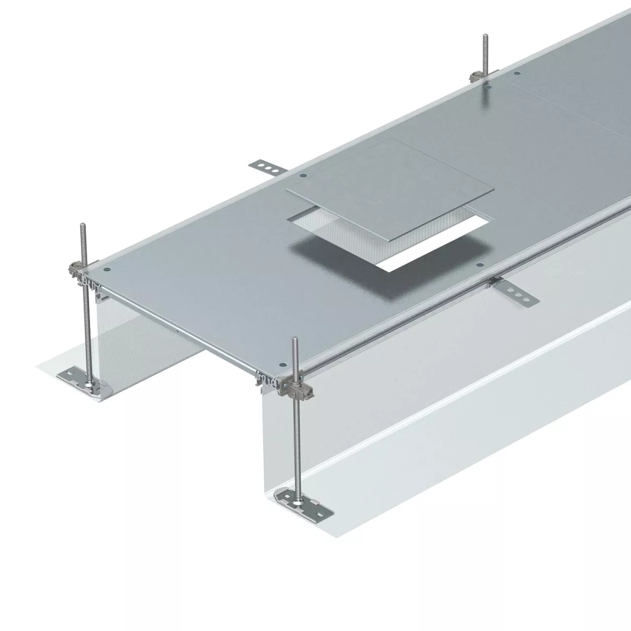 Gotowa do montażu jednostka kanału do prowadzenia przewodów z 3 lub 6 pokrywami, do montażu kasety zasilającej rozm. znam. 4, składająca się z dwóch elastycznych profili bocznych z metalowej siatki, profili nakładanych wykładziny podłogowej o grubości 4 mm. W komplecie znajduje się 6 kątowników mocujących o regulowanej wysokości, 6 kotw do jastrychu i 3 uszczelki stykowe pokrywy (dla szerokości znamionowych kanałów 200 i 300) lub 3 wsporniki stykowe pokrywy dla szerokości znamionowej kanału 400 i 6 dla szerokości znamionowych kanałów 500 i 600. Konieczne elementy niwelujące (należy przestrzegać wysokości regulacji) do wspornika pokrywy 400, 500 i 600 nie wchodzą w zakres dostawy, i należy je zamawiać osobno. Pokrywa kanału do szerokości znamionowej 400 jest przykręcona śrubami.
