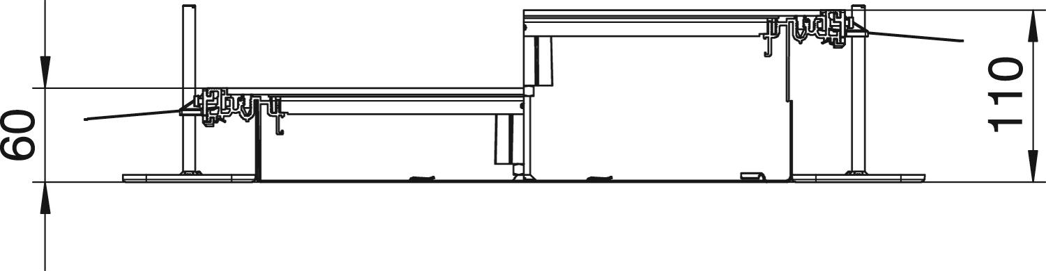 Gotowa do montażu jednostka kanału z 3 samozatrzaskowymi pokrywami zaślepiającymi do prowadzenia przewodów, składająca się z dna kanału (kanał kablowy podłogowy z profilami bocznymi i nakładanymi wykładziny podłogowej) i pokrywy kanału. Kanał kablowy podłogowy z nakładkami ustalającymi do samoczynnego łączenia mostków. W dostawie zawartych jest 6 kątowników mocujących o regulowanej wysokości, 6 kotw do jastrychu i uszczelki stykowe pokrywy (3 szt. dla szerokości znamionowych kanałów 200 i 300) lub regulowane wsporniki stykowe pokrywy: 3 szt. dla szer. znam. kanału 400 i 6 szt. dla szer. znam. kanału 500 i 600. Pokrywy kanału są przykręcone śrubami.