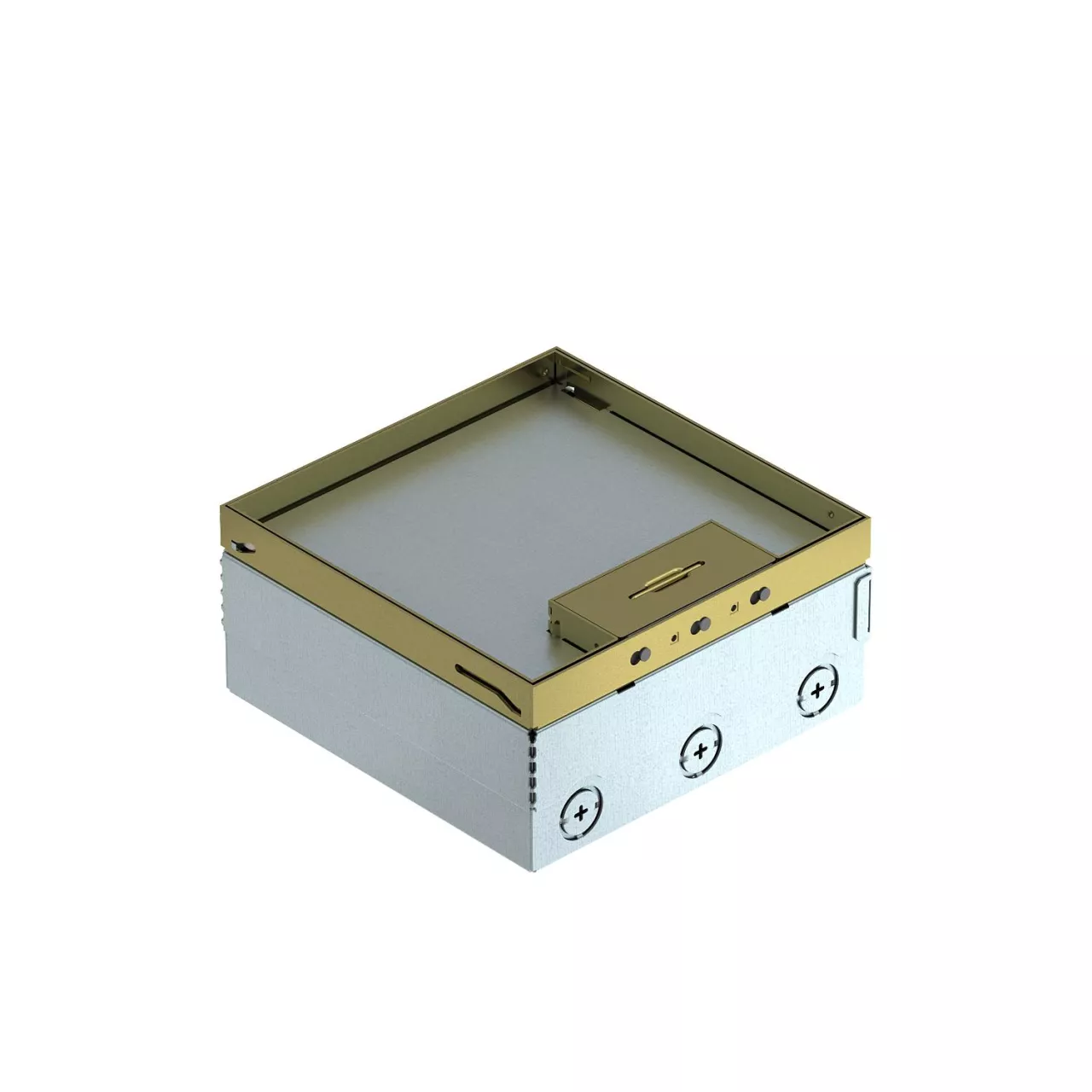 Kwadratowa kaseta zasilająca do montażu w podłogach technicznych i wylewkach czyszczonych na sucho. Obudowa z wejściami do wprowadzania peszli (M25). Pokrywa licowana do górnej krawędzi podłogi za pomocą 4 wsporników regulujących. Minimalna głębokość montażowa 95 mm, zakres regulacji + 30 mm.