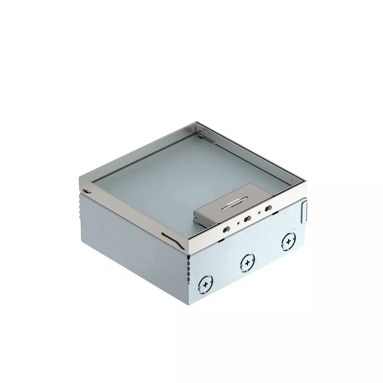 Kwadratowa kaseta zasilająca do montażu w podłogach technicznych i wylewkach czyszczonych na sucho. Obudowa z wejściami do wprowadzania peszli (M25). Pokrywa licowana do górnej krawędzi podłogi za pomocą 4 wsporników regulujących. Minimalna głębokość montażowa 95 mm, zakres regulacji + 30 mm.
