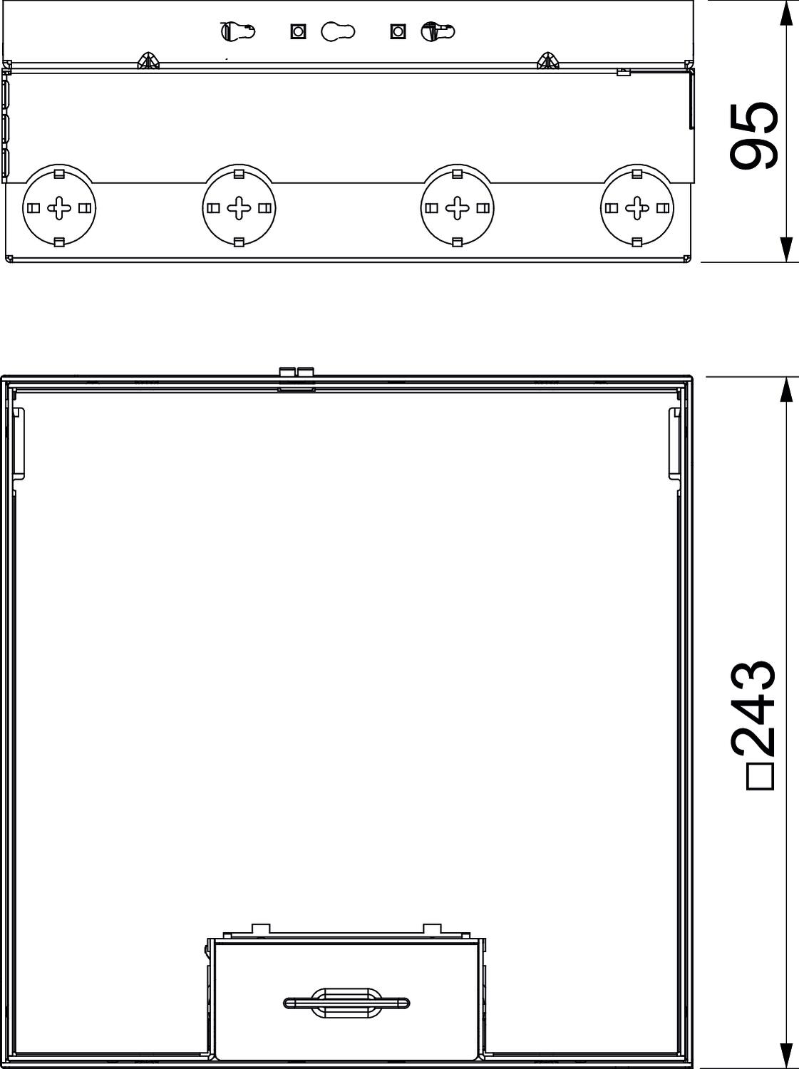 Kwadratowa kaseta zasilająca do montażu w podłogach technicznych i wylewkach czyszczonych na sucho. Obudowa z wejściami do wprowadzania peszli (M25). Pokrywa licowana do górnej krawędzi podłogi za pomocą 4 wsporników regulujących. Minimalna głębokość montażowa 95 mm, zakres regulacji + 30 mm.