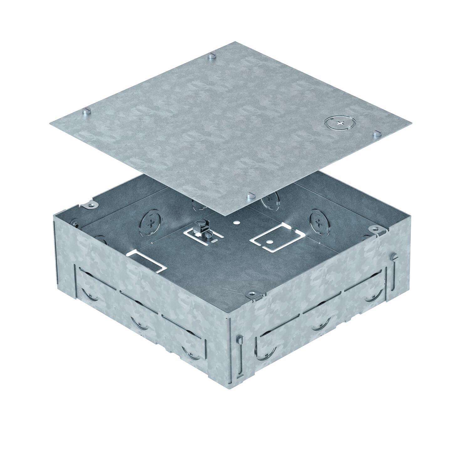 Kwadratowa obudowa montażowa do kasety zasilającej GES4-2 do stosowania w wylewkach. Z wejściami do wprowadzania peszli (M25) na wszystkich czterech ściankach.