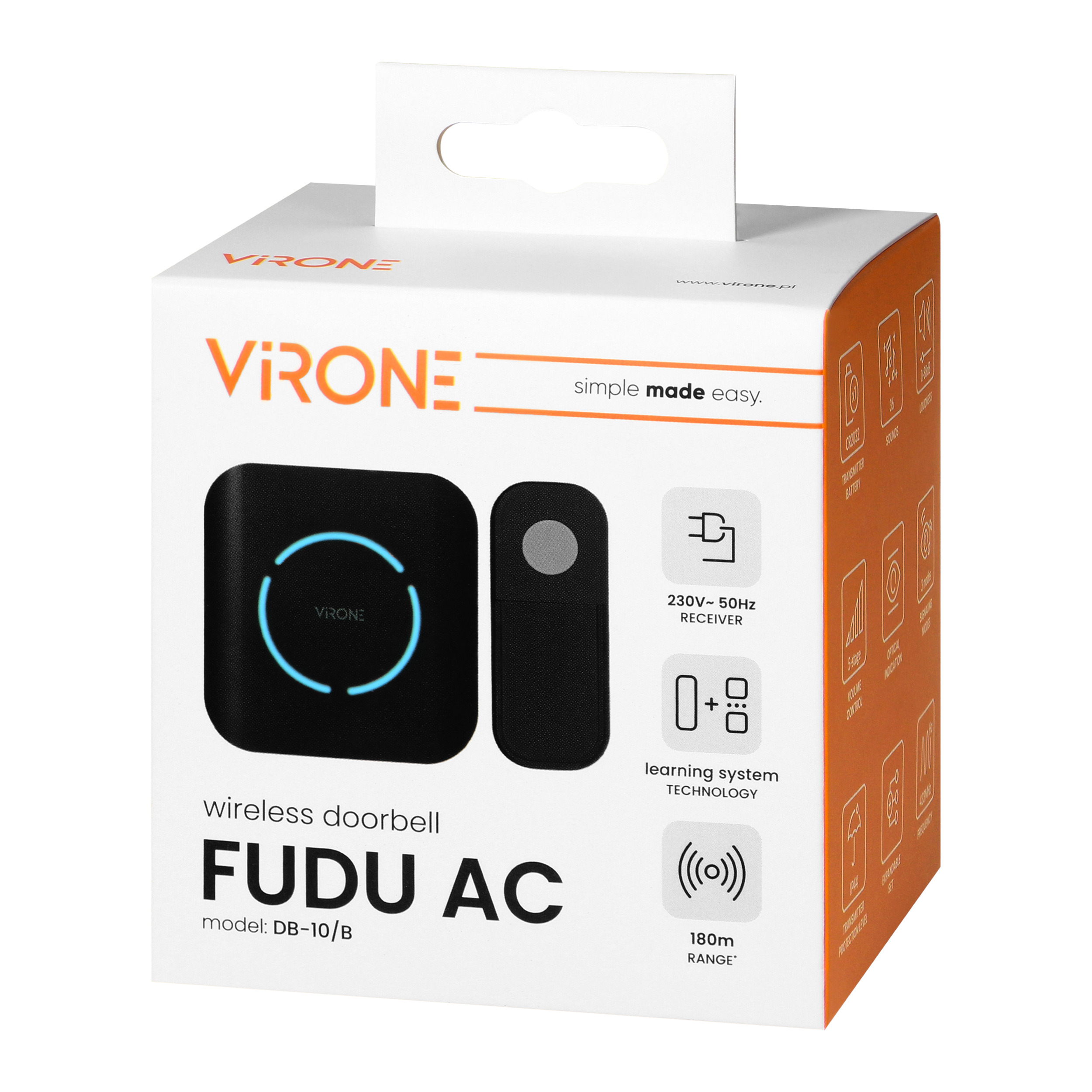 FUDU AC to nowoczesny i funkcjonalny dzwonek bezprzewodowy sieciowy, który idealnie sprawdzi się zarówno w domu, jak i w biurze. Odbiornik wystarczy podpiąć do gniazdka. Pracuje przy napięciu znamionowym 230V. Nadajnik natomiast korzysta z baterii CR2032. Bateria w zestawie. Urządzenie działa na stabilnej częstotliwości 433,92MHz. W otwartym terenie osiąga zasięg do 180 m.