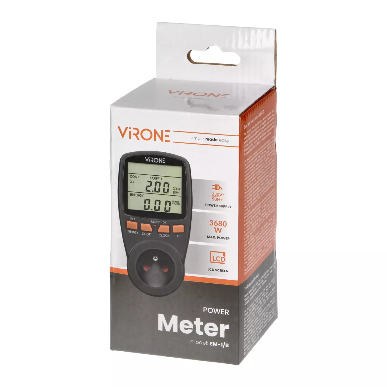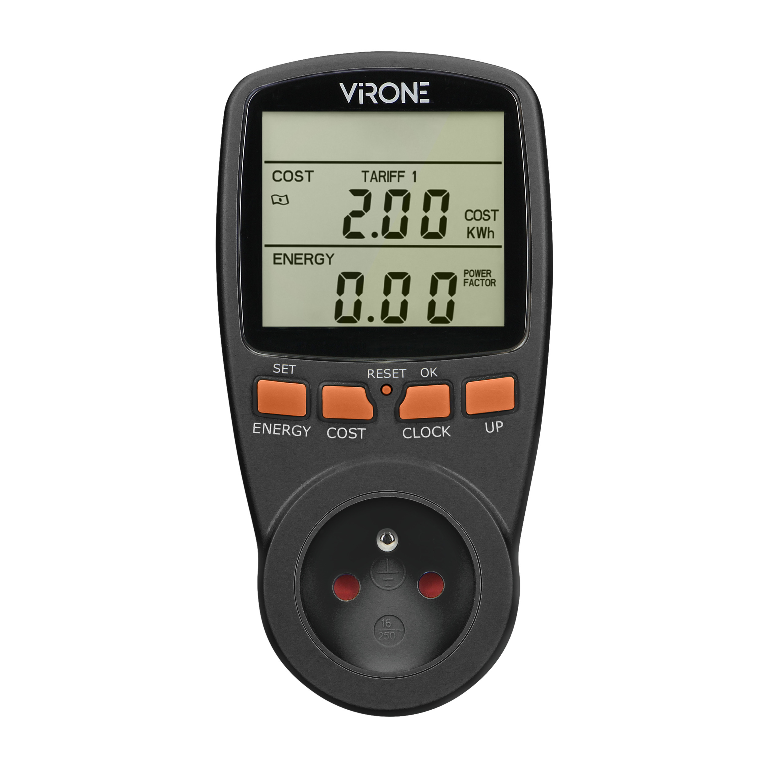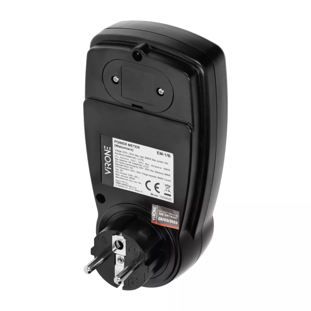 Watomierz umożliwia nam sprawdzenie zużycia prądu elektrycznego i obliczenie kosztów zużytej energii podłączonego urządzenia (2 oddzielne taryfy). Duży wyświetlacz LCD pokazuje dodatkowo aktualny czas, napięcie i natężenie prądu, współczynnik mocy, częstotliwość, maksymalne obciążenie prądu i ostrzeżenie o przeciążeniu, możliwość wprowadzenia 4 rodzajów waluty. Wewnętrzny akumulator: 2 × 1,5V LR44 podtrzymuje ustawienia urządzenia w razie braku prądu. Kolor czarny.