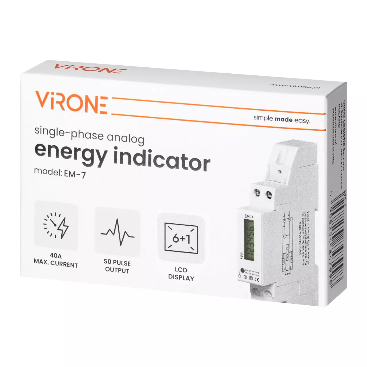 Pobór energii w fazie sygnalizowany jest miganiem diody LED. Liczba impulsów jest przeliczana na energię pobraną, a jej wartość wskazywana jest przez wyświetlacz LCD (6+1). Dodatkowo wskaźnik jest wyposażony w elektryczne wyjście impulsowe typu S0, które generuje 500 imp/kWh.