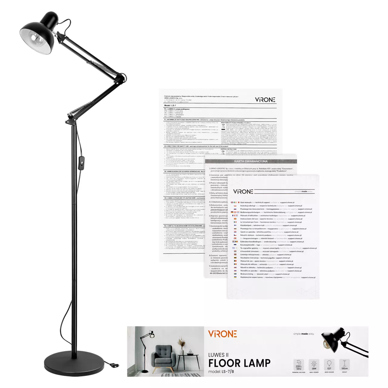Przewód o długości 3 m z wbudowanym włącznikiem umożliwia ustawienie lampy w znacznej odległości od gniazdka bez potrzeby stosowania dodatkowego przedłużacza. Regulowana wysokość LUWES II zapewnia komfort użytkowania. Przeznaczona do użytku wewnątrz pomieszczeń (IP20). Klosz wykonany jest metalu, a obudowa ze stali. Całość wykończona czarnym kolorem. Wymiary: Ø280×1820 mm.