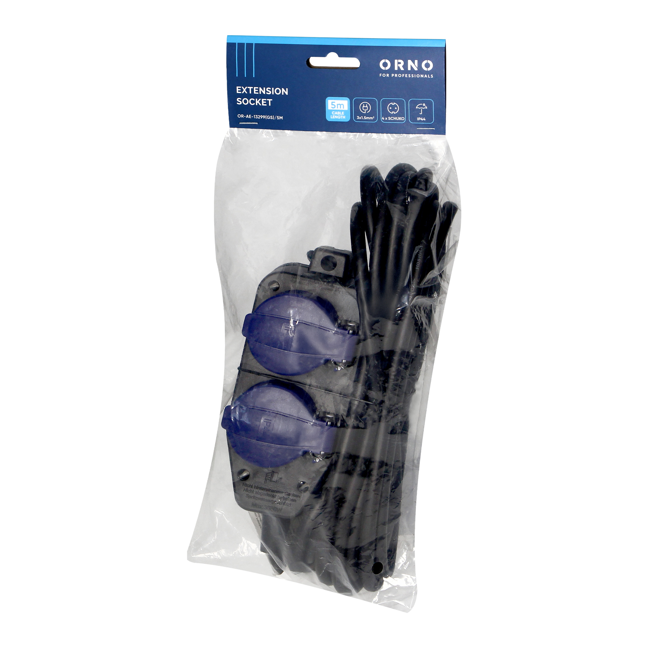 Gniazda z przesłonami torów prądowych i klapkami zabezpieczającymi, charakterystyczne dla wysokiej jakości produktów marki ORNO for PROFESSIONALS, skutecznie chronią przed wnikaniem brudu i wilgoci. Stopień ochrony IP44 oznacza, że przedłużacz może być podłączony zarówno w przestrzeniach wewnętrznych, jak i zewnętrznych.