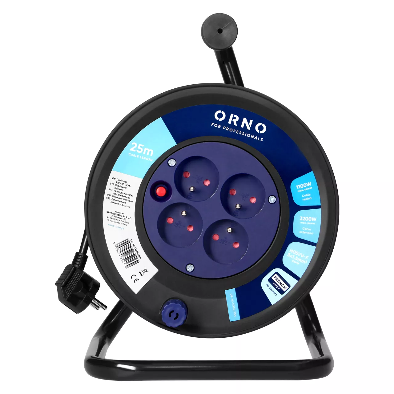 Przedłużacz bębnowy, 4 gniazda 2P+Z, kabel PVC H05VV-F 3x1,5mm², długość 25m, termik, przesłony torów prądowych