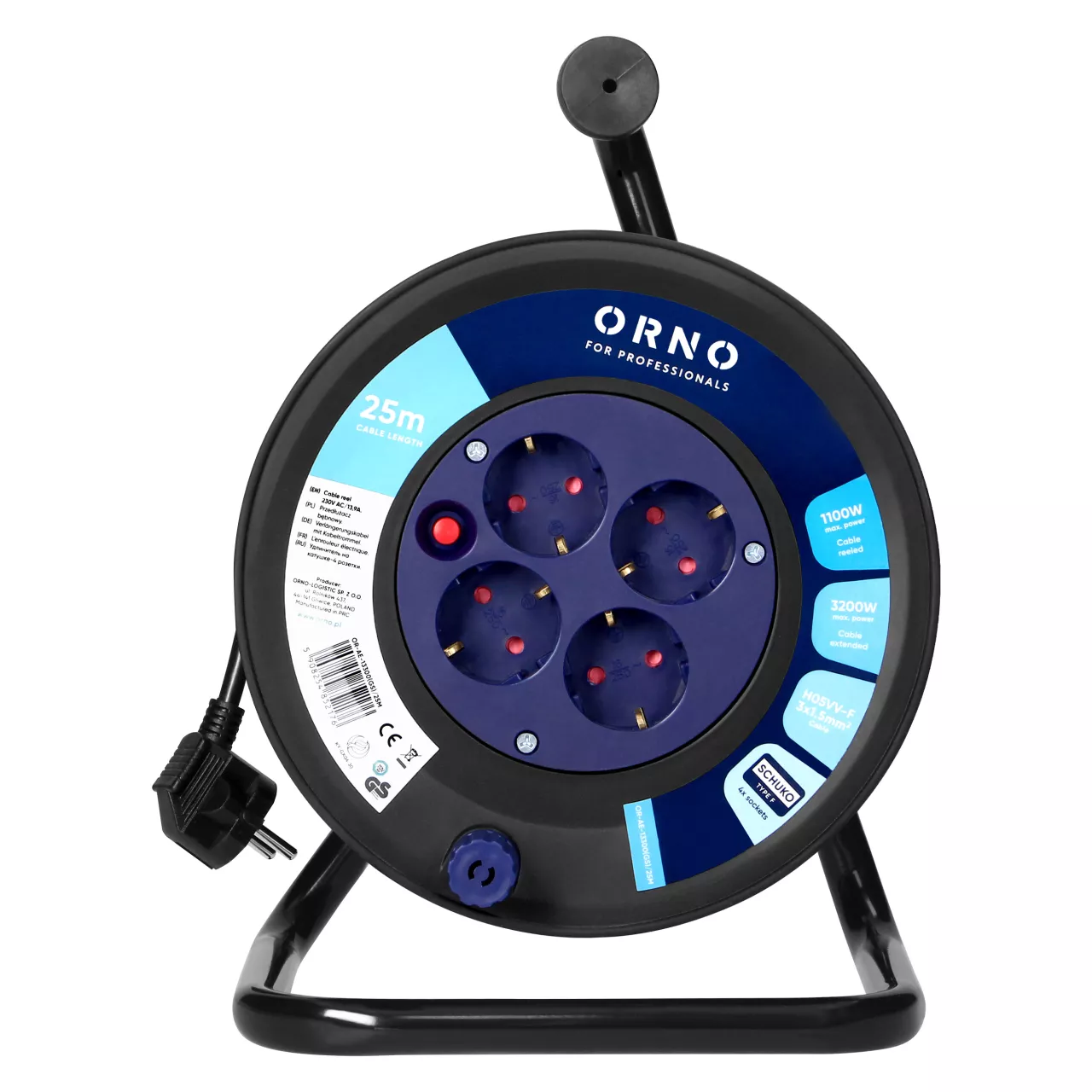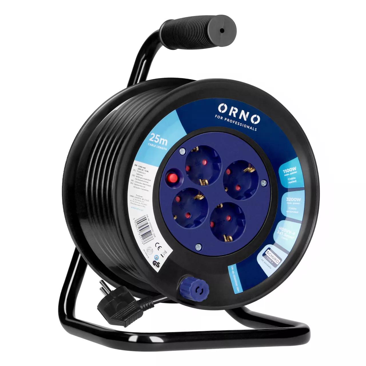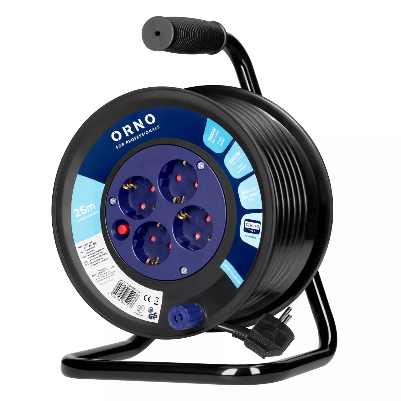 Przedłużacz bębnowy, 4 gniazda 2P+Z, Schuko, kabel PVC H05VV-F 3x1,5mm², długość 25m, termik, przesłony torów prądowych