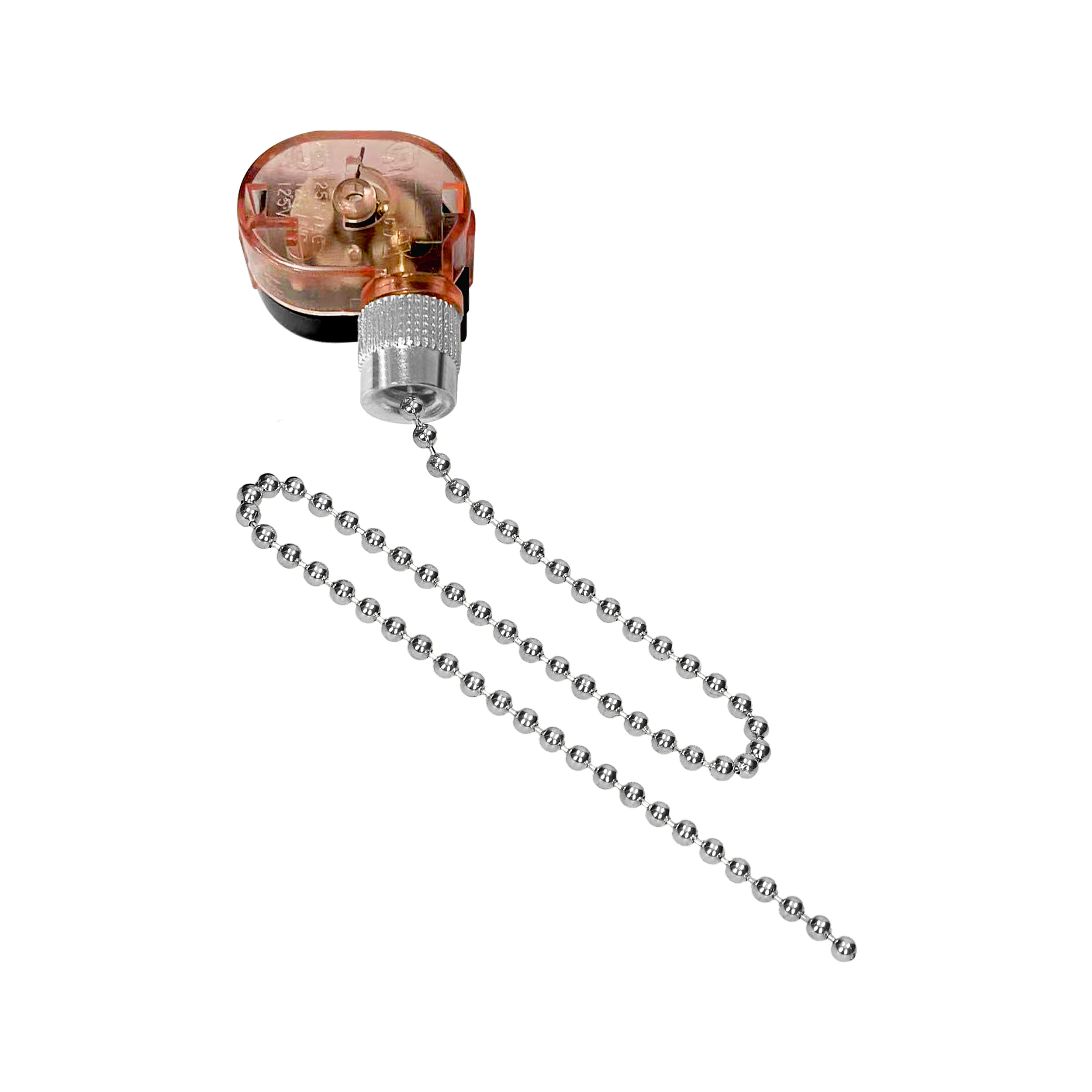 Korpus wykonany z PC i miedzi zapewnia stabilne działanie. Srebrne, błyszczące wykończenie pasuje do lamp i urządzeń o chłodniejszych kolorach obudowy. Srebrny element sterujący dobrze wyróżnia się na czarno/transparentnym tle, więc od razu widzisz, gdzie znajduje się cięgno (łańcuszek).