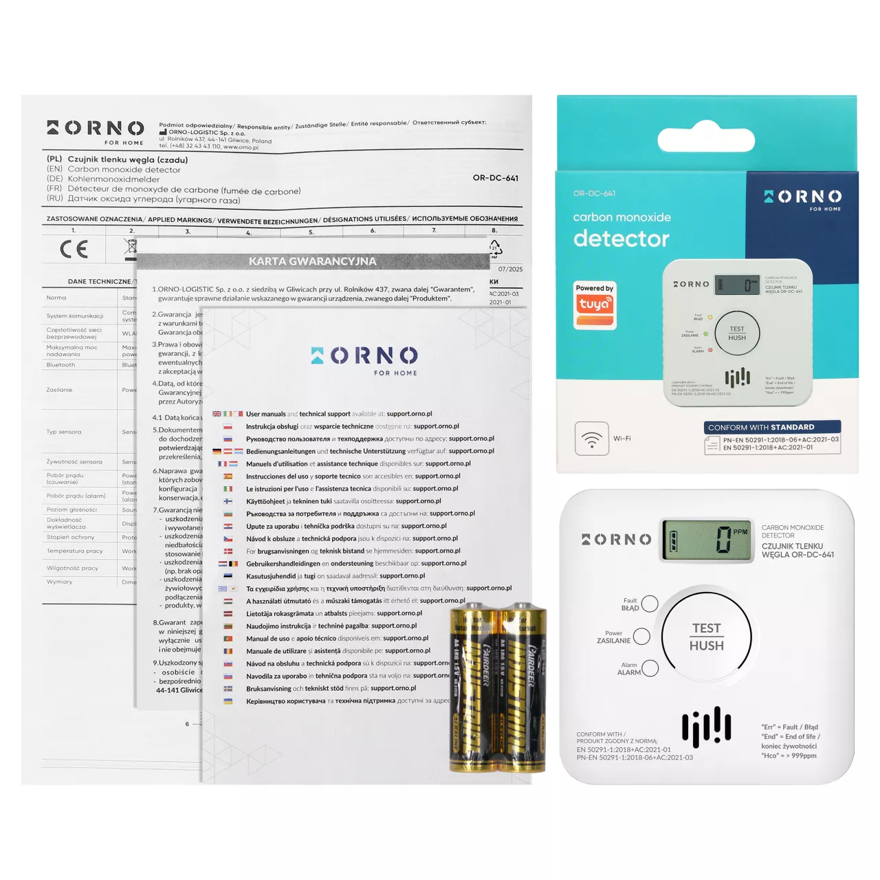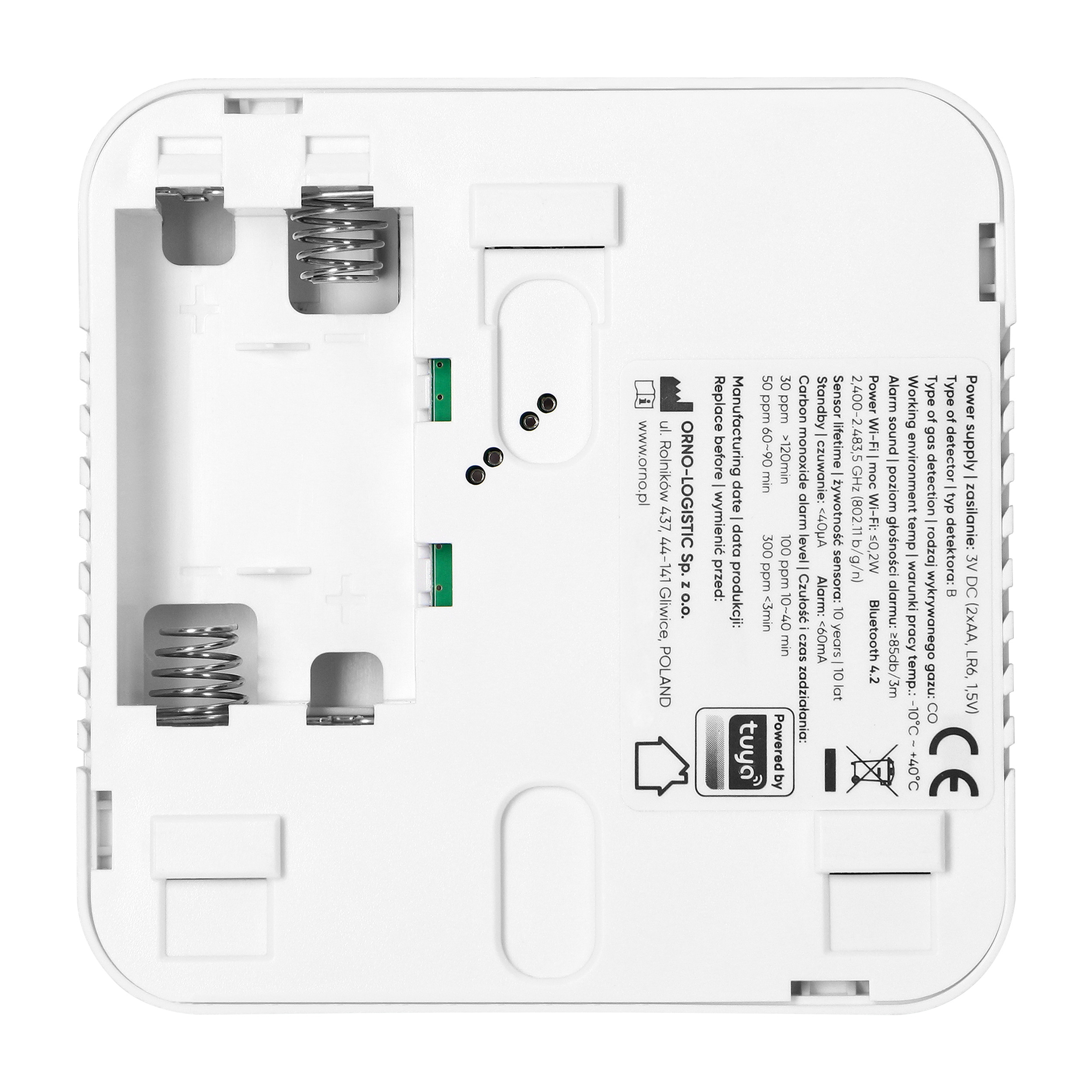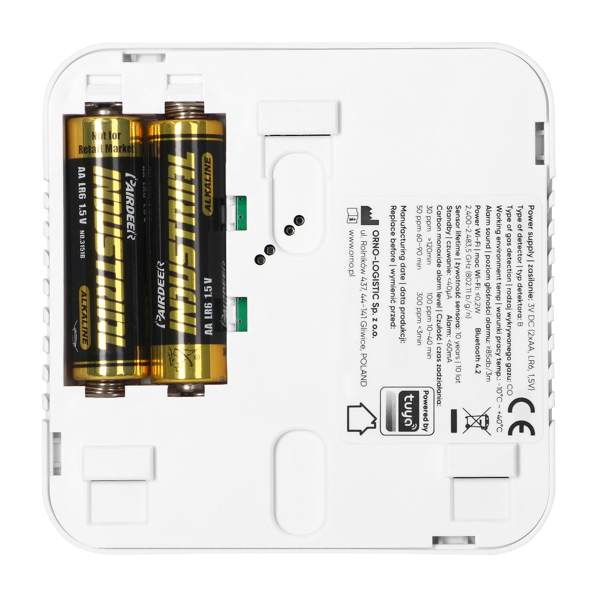 Produkt posiada podświetlany przycisk TEST, który pozwala sprawdzić poprawność działania czujnika. Żywotność czujnika wynosi 10 lat. Zasilany jest dwoma bateriami alkaicznymi AA (dołączone do zestawu). Wymiary urządzenia: 93x93x28,5 mm.