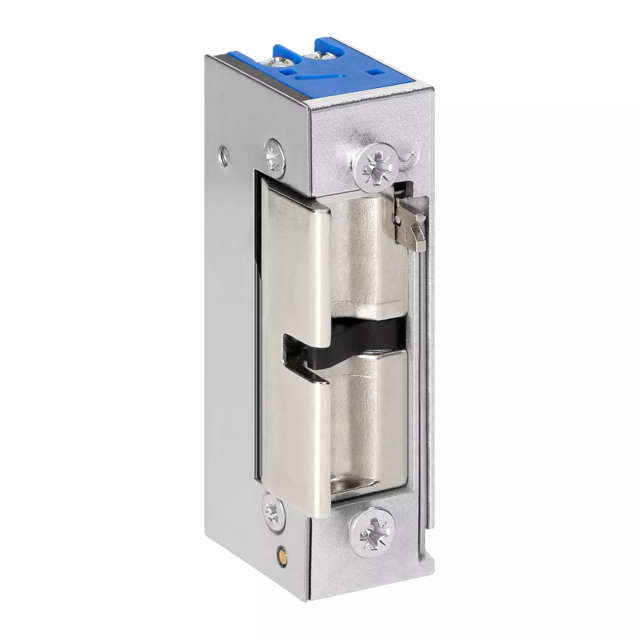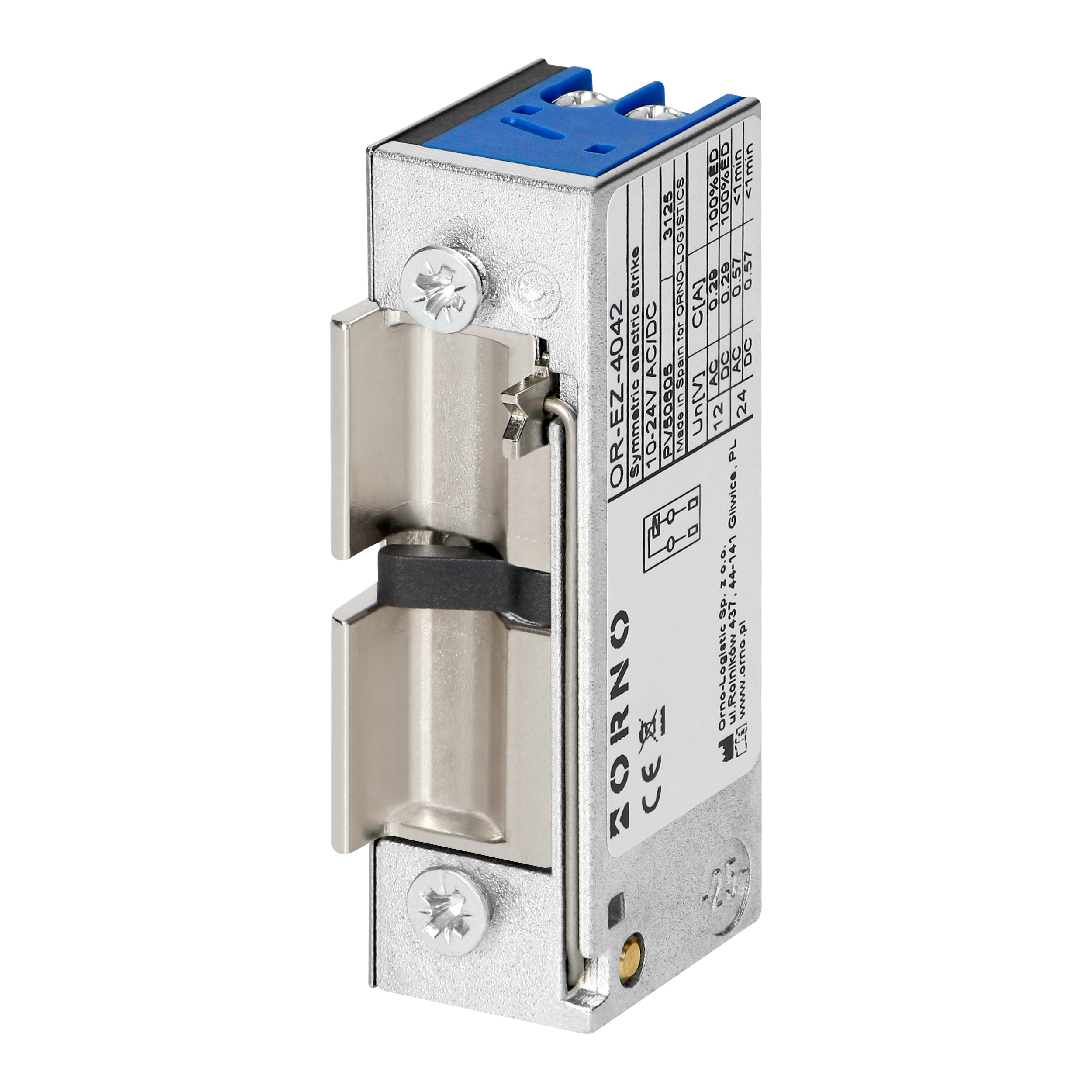 Elektrozaczep symetryczny z pamięcią i blokadą, przystosowany do obydwu kierunków otwierania drzwi (prawy/lewy).